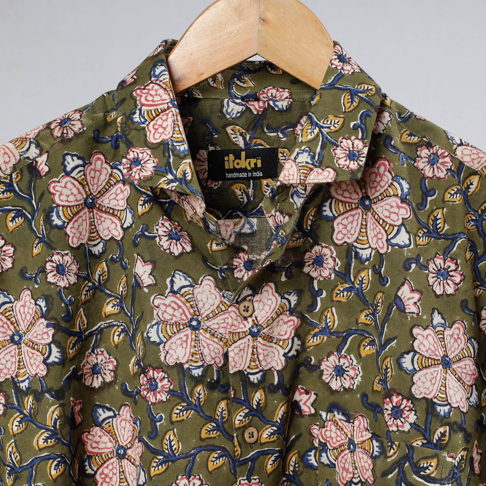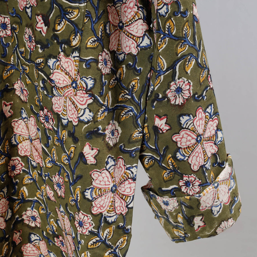Fine quality green bagru dabu hand block printed cotton full sleeve shirt. This shirt is made using natural dyes through a traditional mud resist process using hand-carved wooden blocks practised in Bagru, Rajasthan.