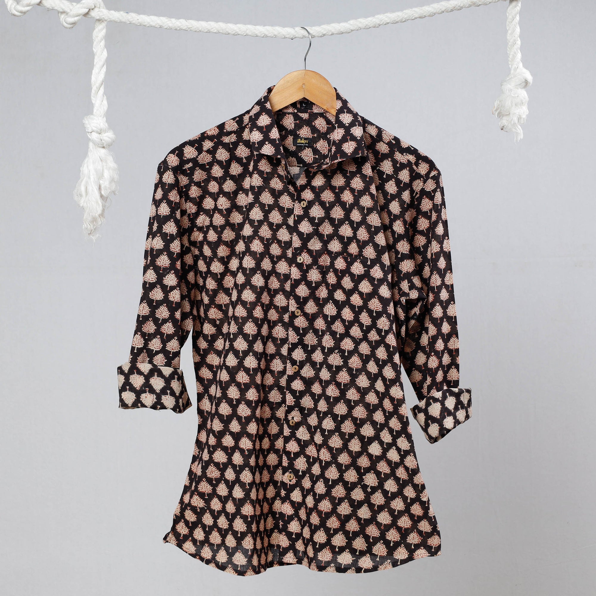 Fine quality black bagru hand block printed cotton full sleeve shirt. This shirt is made using natural dyes through a traditional mud resist process using hand-carved wooden blocks practised in Bagru, Rajasthan.