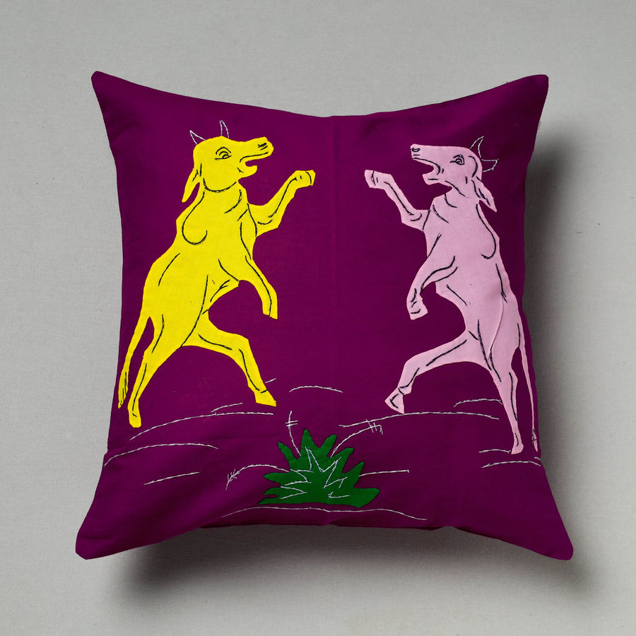 Tribal design hand stitched purple pipli applique work cushion cover made from pure cotton fabrics, handcrafted by artisans of Pipili, the hub of traditional art & craft in Odisha.