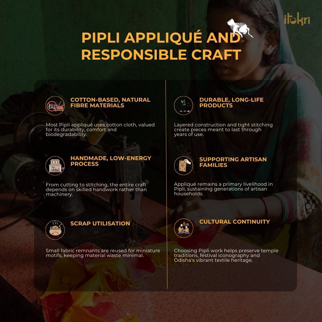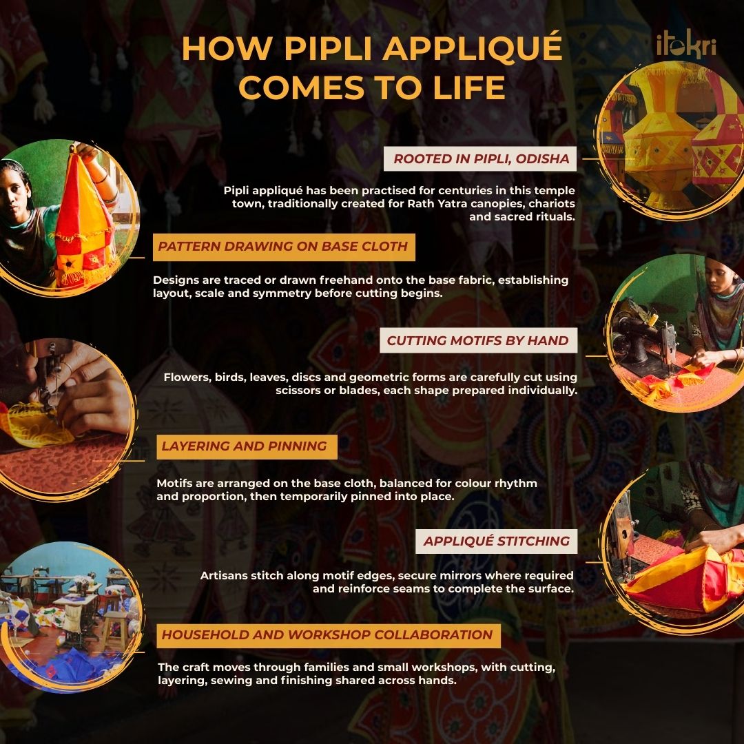 One of Odisha's most colorful crafts is the appliqués at Pipli Craft Village. Locally known as Chandua, this craft is associated with the rituals and traditions of Sir Jagannath and his brothers, Sir Balabhadra and Devi Subhadra.