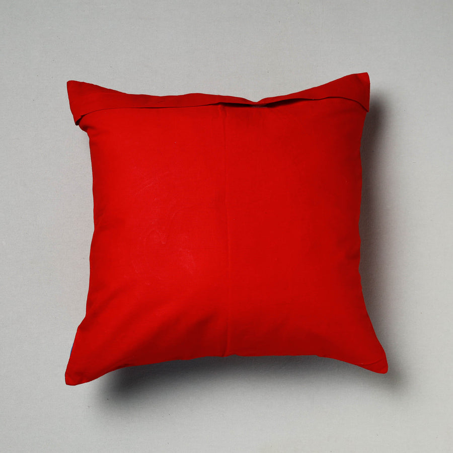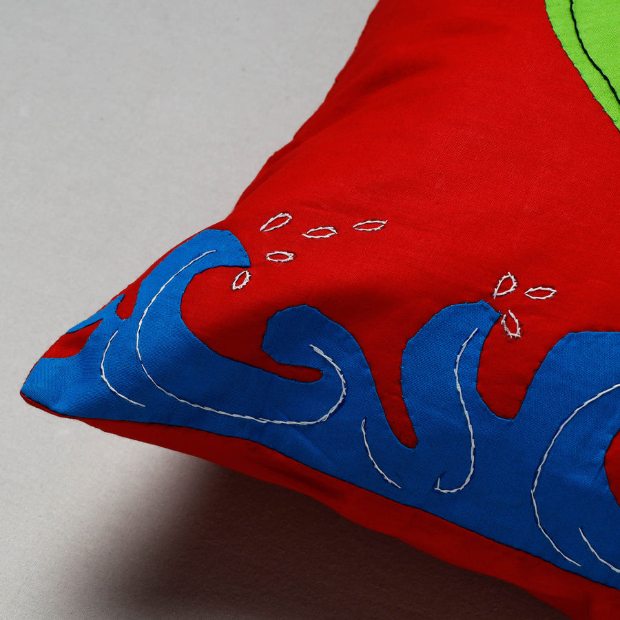 Tribal design hand stitched red pipli applique work cushion cover made from pure cotton fabrics, handcrafted by artisans of Pipili, the hub of traditional art & craft in Odisha.