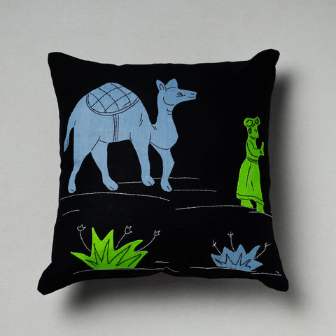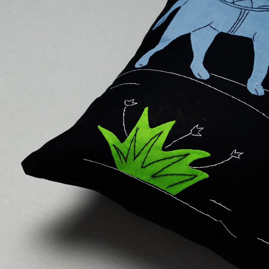 Tribal design hand stitched black pipli applique work cushion cover made from pure cotton fabrics, handcrafted by artisans of Pipili, the hub of traditional art & craft in Odisha.