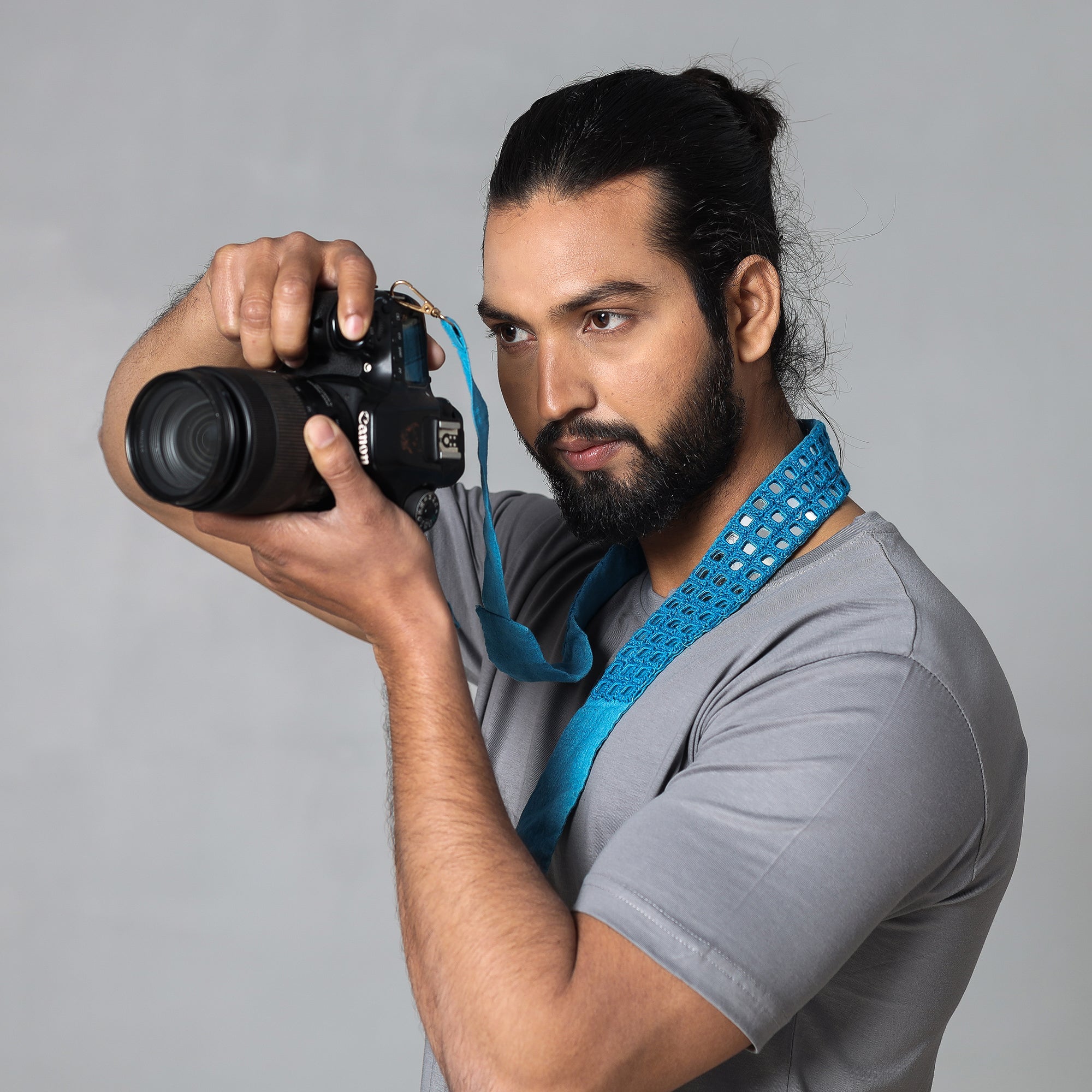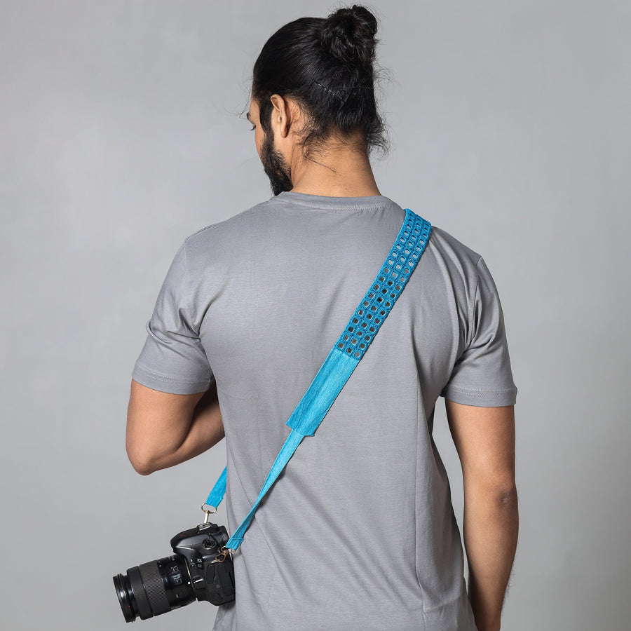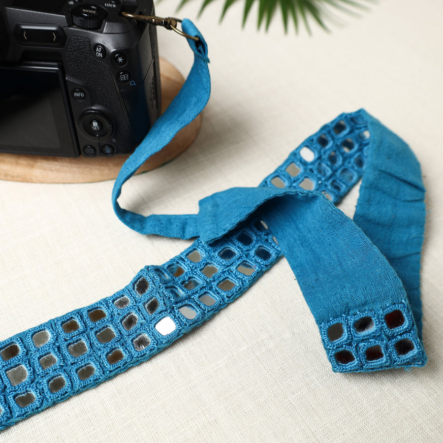 Handcrafted mirror work kutch hand embroidery cotton camera belt. The Kutch Embroidery is a handicraft and textile signature art tradition of the tribal community of kutch district in Gujarat. This embroidery with its rich designs has made a notable contribution to the Indian embroidery traditions. The embroidery, practiced normally by women is generally done on fabrics of cotton, in the form of a net using cotton or silk thread.