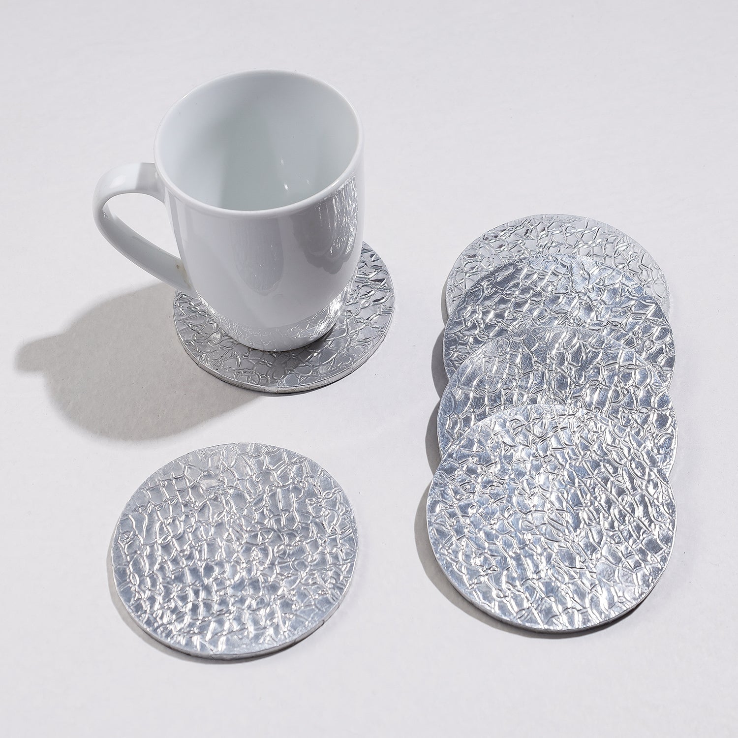 Handcrafted papier mache metal coated coasters. Raw Material used *The basic raw material for this craft which is used to prepare is paper pulp, metal sheet and edible glue. These attractive coasters are hand crafted from papier mache and metal by skilled artisans of Rampur.