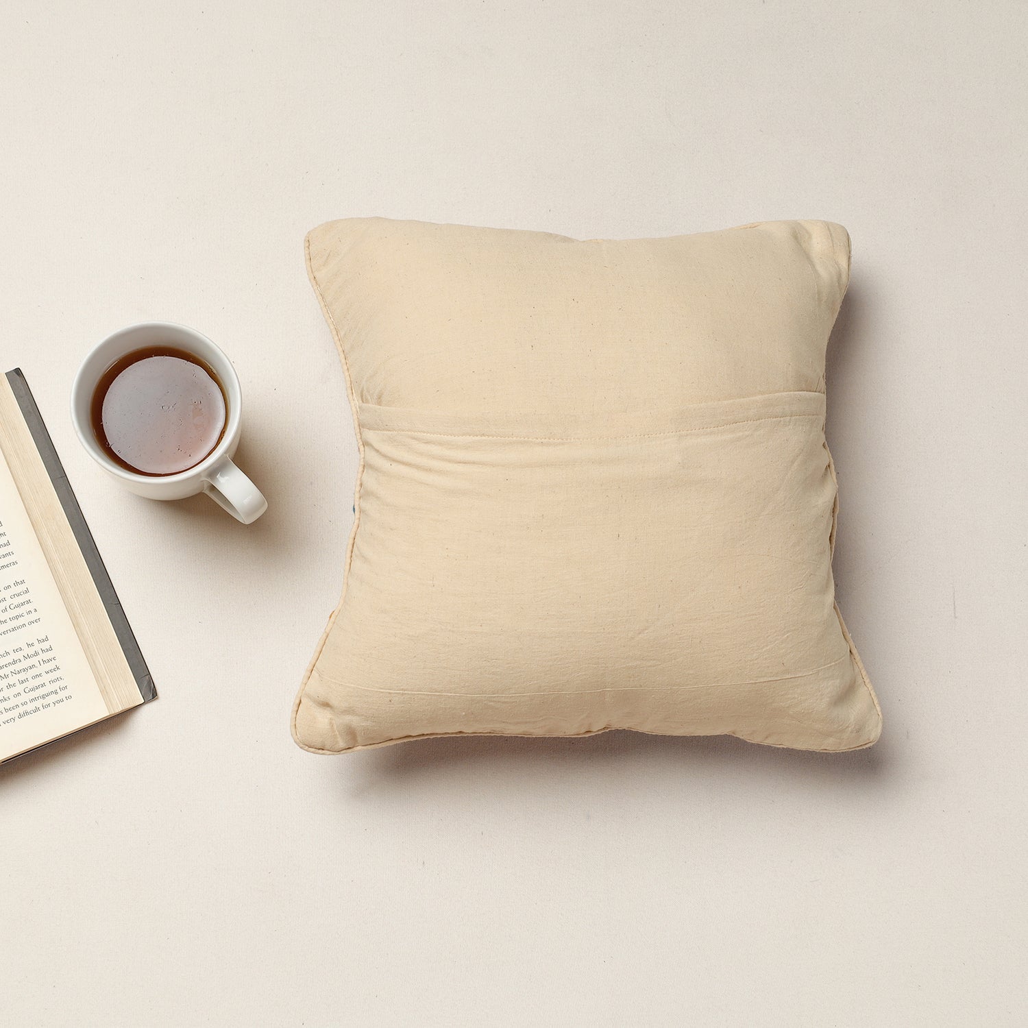 Fine quality Rabari hand embroidery cotton cushion cover. This cushion cover is made from cotton fabric with beautiful Rabari embroidery by artisans of Kala Raksha. Rabari embroidery is unique to the nomadic Rabaris. Essential to Rabari embroidery is the use of mirrors in a variety of shapes. Rabaris outline patterns in chain stitch, then decorate them with a regular sequence of mirrors and accent stitches, in a regular sequence of colors. Rabaris also use decorative back stitching, called bakhiya.