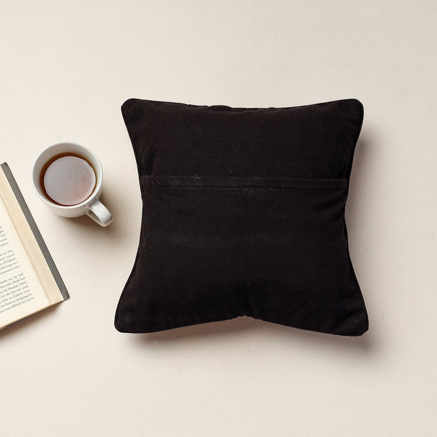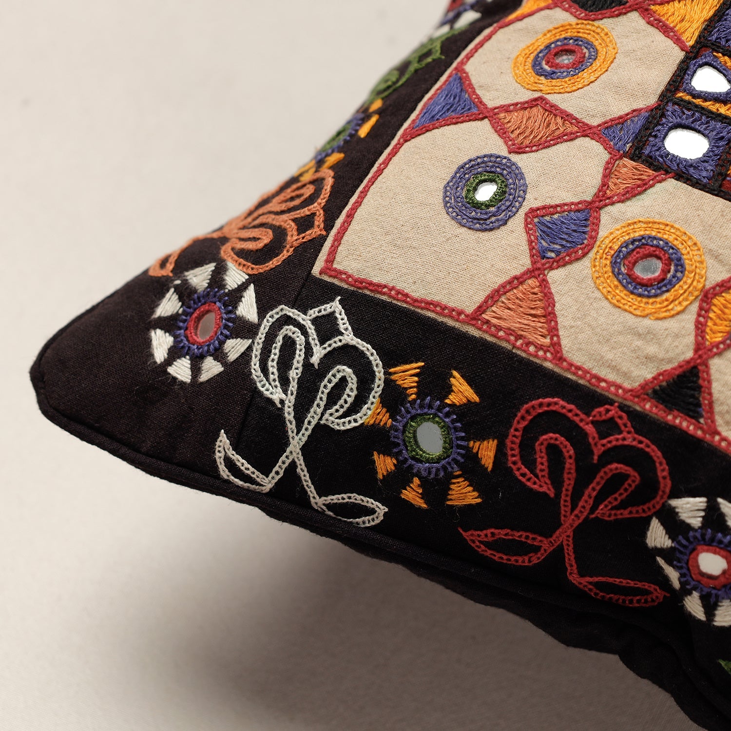 Fine quality Rabari hand embroidery cotton cushion cover. This cushion cover is made from cotton fabric with beautiful Rabari embroidery by artisans of Kala Raksha. Rabari embroidery is unique to the nomadic Rabaris. Essential to Rabari embroidery is the use of mirrors in a variety of shapes. Rabaris outline patterns in chain stitch, then decorate them with a regular sequence of mirrors and accent stitches, in a regular sequence of colors. Rabaris also use decorative back stitching, called bakhiya.