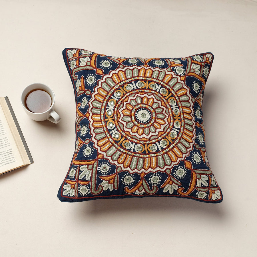 Fine quality Pakko hand embroidery mirror work cotton cushion cover. This cushion cover is made from cotton fabric with beautiful Pakko embroidery by artisans of Kala Raksha. Paako literally solid, is a tight square chain and double buttonhole stitch embroidery, often with black slanted satin stitch outlining. The motifs of paako, sketched in mud with needles, are primarily floral and generally arranged in symmetrical patterns.