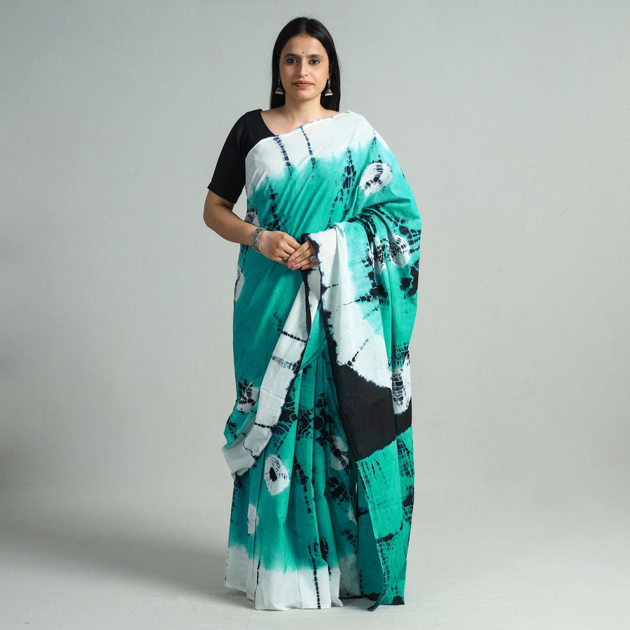 Fine quality shibori tie-dye mul cotton saree from Jahota, Rajasthan. This saree is hand dyed using shibori tie and dye technique in which the fabric is tied using clamp or stitches in the required design and the pattern is dyed.