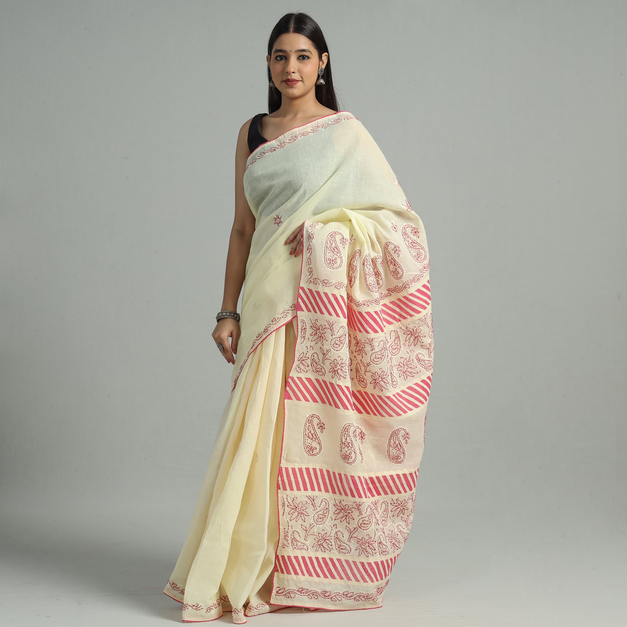 Fine quality hand-stitched applique cut work chanderi silk cotton saree with tassels. It's unique style appliqué work does magic in light and shade with beautiful stories and patterns. Chanderi silks are known for its gossamer looks and amazing feel.