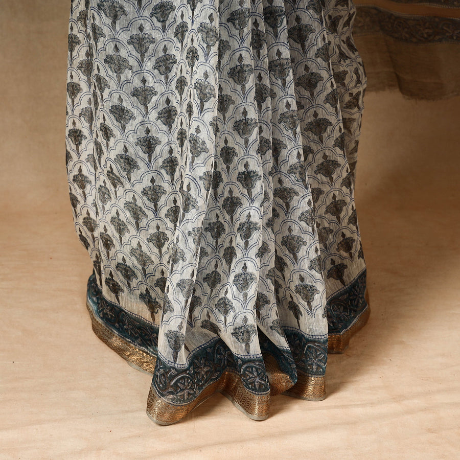 Fine quality traditional sanganeri block printing chanderi silk saree with zari border. Sanganeri is a hand-block printing technique originating from Sanganer, a village in the southern part of Jaipur, Rajasthan. Chanderi silks are known for its gossamer looks and amazing feel.