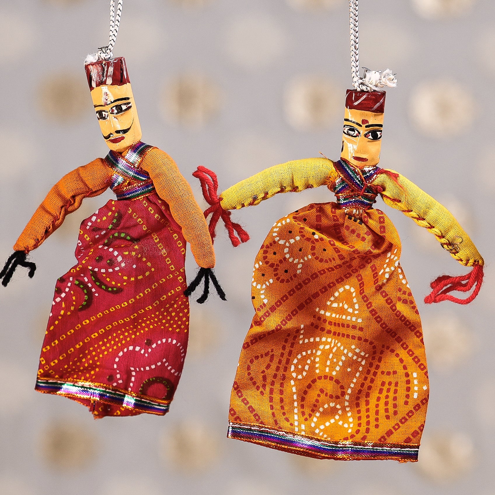 Beautifully handcrafted Rajasthani dancing couple puppet / kathputli (small). In Rajasthan the puppet tradition is called Kathputli, where Kaath means wood and Putli means Puppet. Kathputli means a puppet made out of wood. However Kathputlis typically have wooden torso and shoulders while the legs (absent in the ones based on a female character) and arms are made of clothes stuffed with cotton. Kathputli’s are string puppets controlled by strings which passes from the top of the puppets and manipulated by the puppeteer. These highly decorative handmade puppets are the source of age old tradition of narration of historical stories, myths and legends. The narrations were accompanied with music and dialogues delivered by the group members. Kathputli became one of the most important and well know performing arts of Rajasthan and it represents the tradition, customs and socio-cultural backdrop of the state.