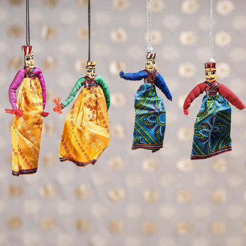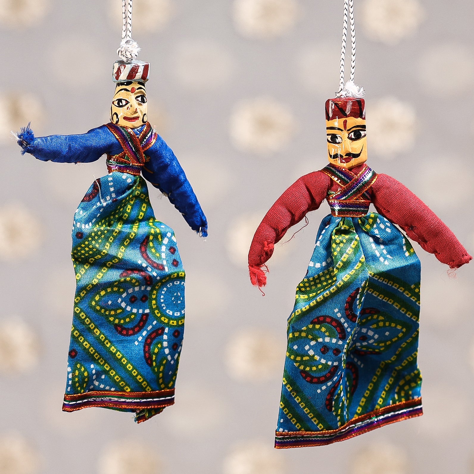 Beautifully handcrafted Rajasthani dancing couple puppet / kathputli (small). In Rajasthan the puppet tradition is called Kathputli, where Kaath means wood and Putli means Puppet. Kathputli means a puppet made out of wood. However Kathputlis typically have wooden torso and shoulders while the legs (absent in the ones based on a female character) and arms are made of clothes stuffed with cotton. Kathputli’s are string puppets controlled by strings which passes from the top of the puppets and manipulated by the puppeteer. These highly decorative handmade puppets are the source of age old tradition of narration of historical stories, myths and legends. The narrations were accompanied with music and dialogues delivered by the group members. Kathputli became one of the most important and well know performing arts of Rajasthan and it represents the tradition, customs and socio-cultural backdrop of the state.