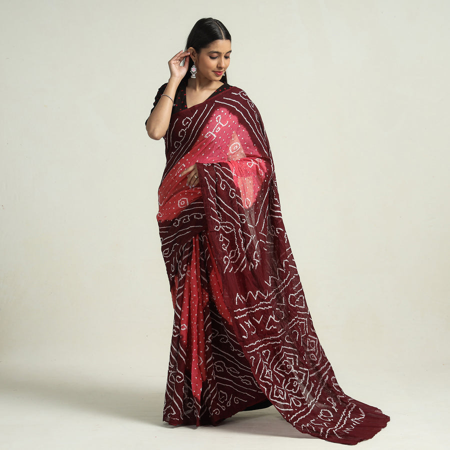 Fine quality maroon kutch bandhani cotton saree featuring majestic bandhani pattern, tie-dyed using the traditional technique practised by the artisans of Kutch. The art of Bandhani (Bandhej) is highly skilled process. The technique involves dyeing a fabric which is tied tightly with a thread at several points.