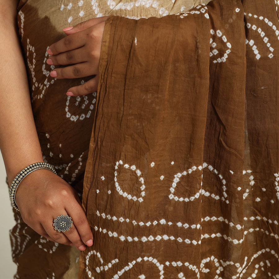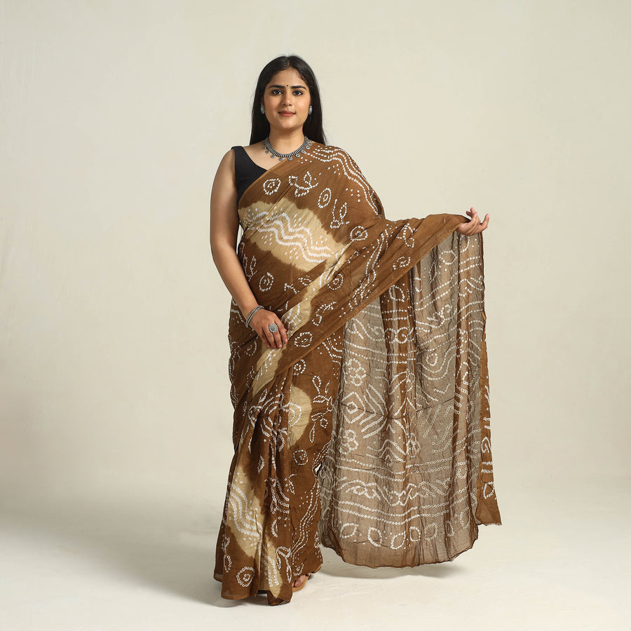 Fine quality brown kutch bandhani cotton saree featuring majestic bandhani pattern, tie-dyed using the traditional technique practised by the artisans of Kutch. The art of Bandhani (Bandhej) is highly skilled process. The technique involves dyeing a fabric which is tied tightly with a thread at several points.
