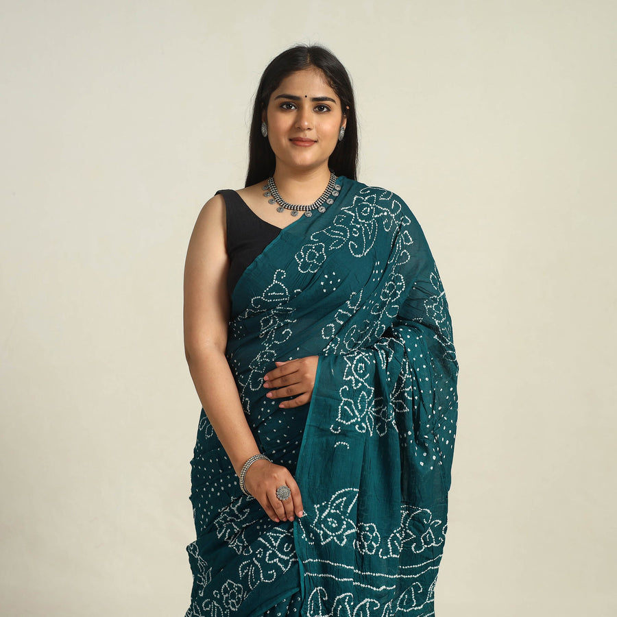 Fine quality green kutch bandhani cotton saree featuring majestic bandhani pattern, tie-dyed using the traditional technique practised by the artisans of Kutch. The art of Bandhani (Bandhej) is highly skilled process. The technique involves dyeing a fabric which is tied tightly with a thread at several points.