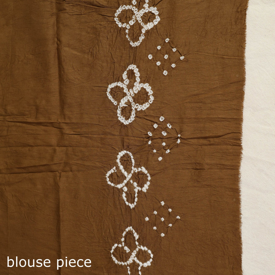 Fine quality brown kutch bandhani cotton saree featuring majestic bandhani pattern, tie-dyed using the traditional technique practised by the artisans of Kutch. The art of Bandhani (Bandhej) is highly skilled process. The technique involves dyeing a fabric which is tied tightly with a thread at several points.