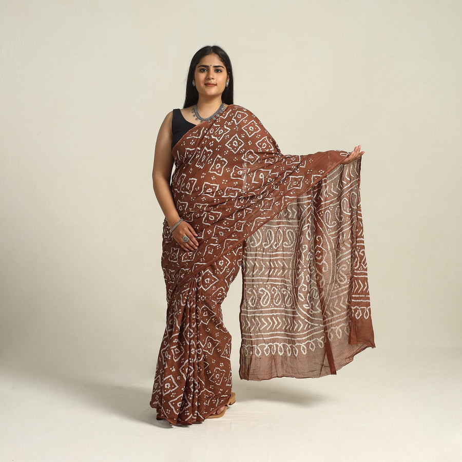 Fine quality brown kutch bandhani checks cotton saree featuring majestic bandhani pattern, tie-dyed using the traditional technique practised by the artisans of Kutch. The art of Bandhani (Bandhej) is highly skilled process. The technique involves dyeing a fabric which is tied tightly with a thread at several points.