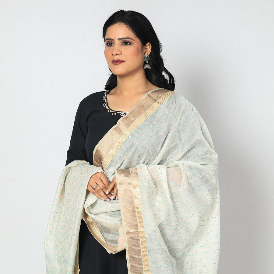 Fine quality special kolaghat kantha work pure maheshwari silk cotton handloom dupatta, designed with contemporary patterns & has been hand embroidered using West Bengal's traditional craft technique of Kantha.