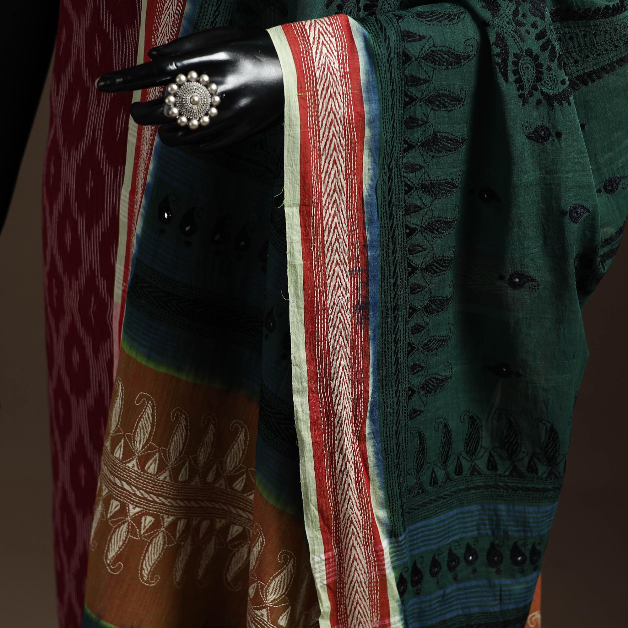 Fine quality green hand embroidered pure cotton handloom dupatta using Bengal's traditional craft technique of kantha done by master artisan Takdira Begum from Bolpur, West Bengal.