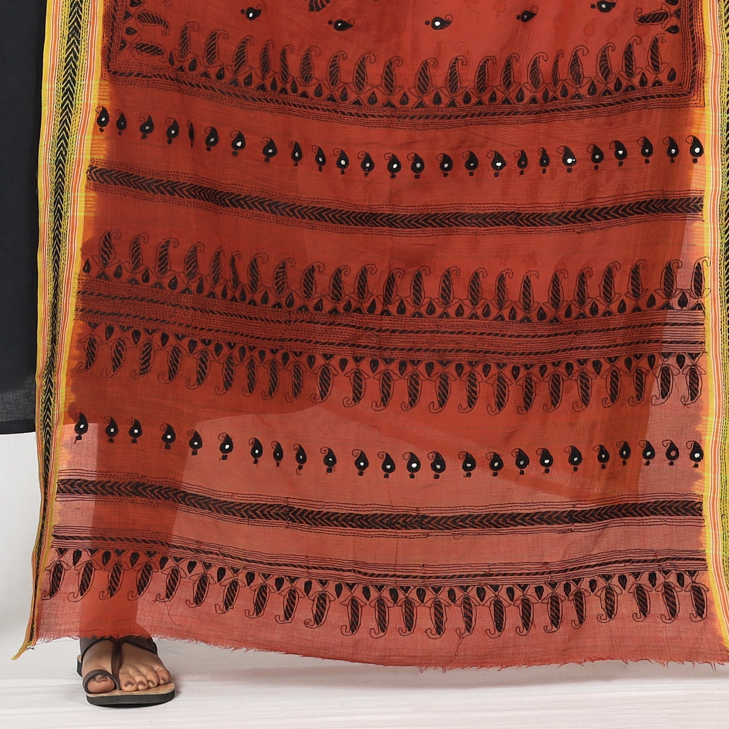 Orange - Handloom Cotton Bengal Hand Kantha Work Dupatta 06