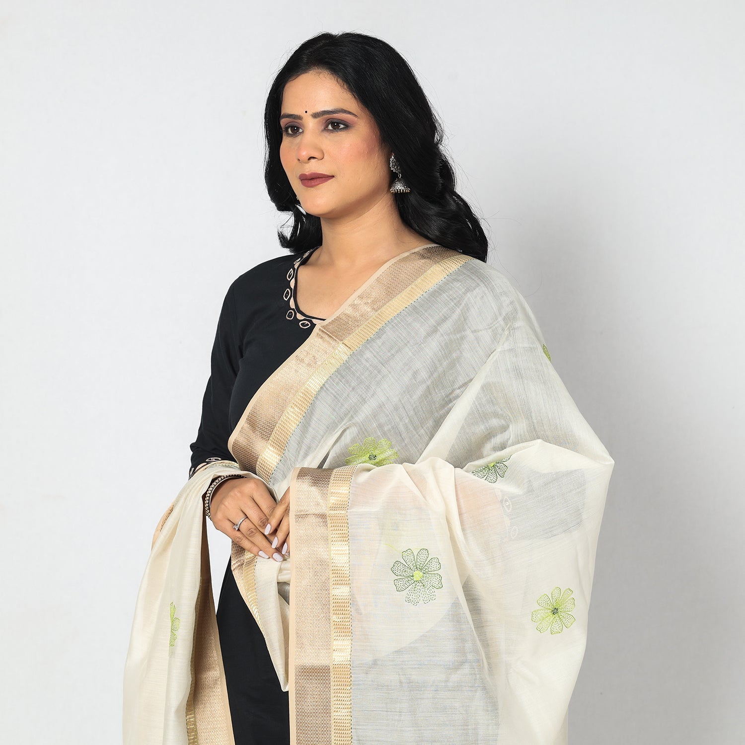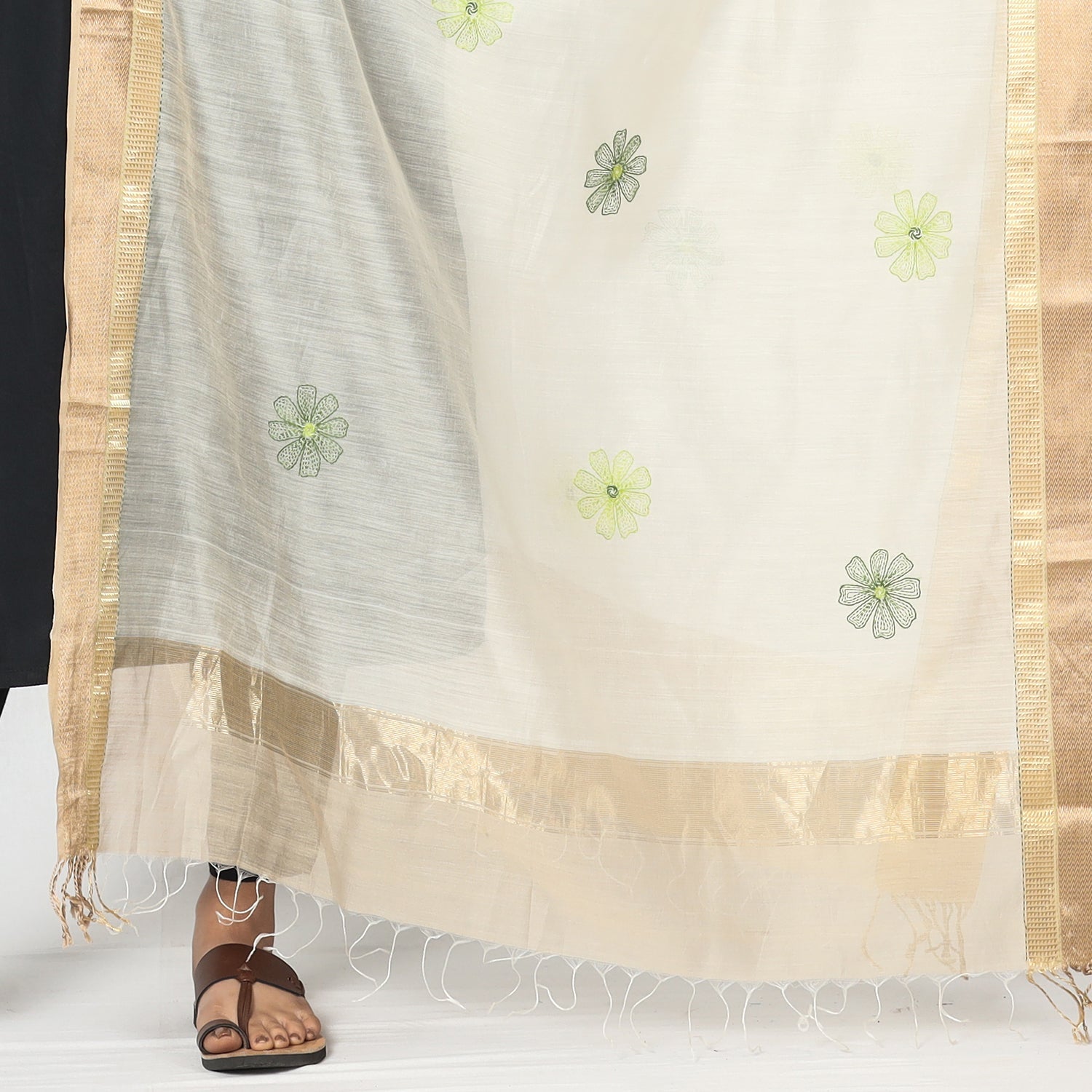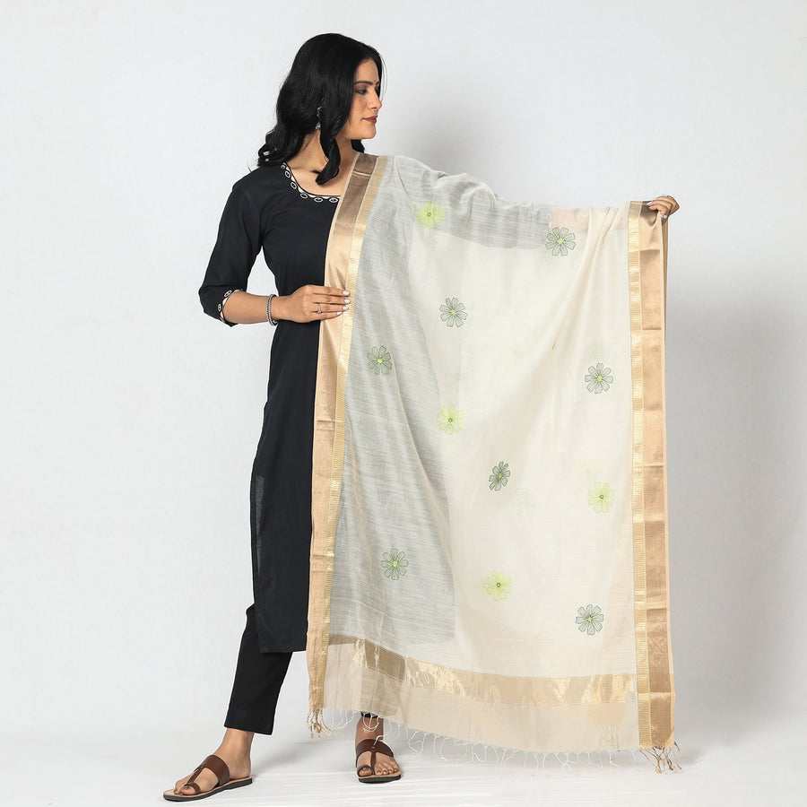 Fine quality special kolaghat kantha work pure maheshwari silk cotton handloom dupatta, designed with contemporary patterns & has been hand embroidered using West Bengal's traditional craft technique of Kantha.