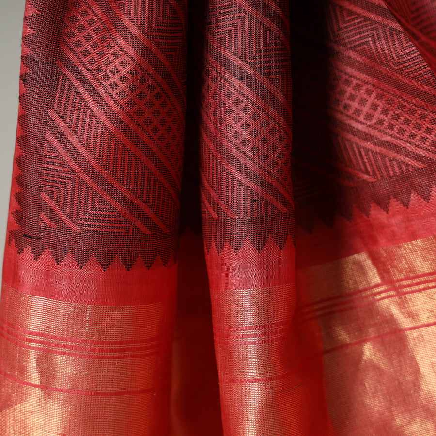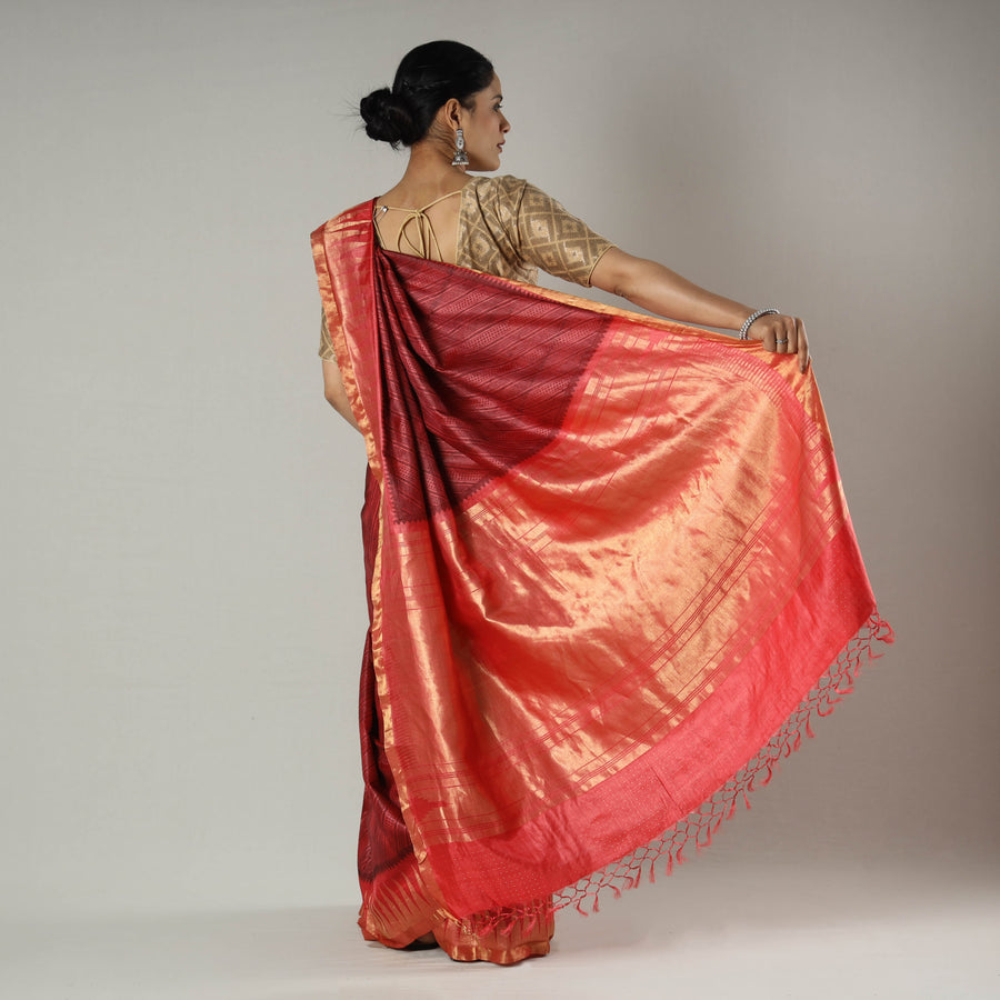 Fine quality pure kosa tussar silk handloom jala weave saree, made by master artisans of Chhattisgarh. Jala weaving is a complicated and intrinsic weaving process. Developing motifs on loom through weaving required well pre-planned designs on graph paper as each motif is crafted with proper count and arithmetic. In Jala weaving there are three famous motifs round floral, lotus, and geometric patterns.