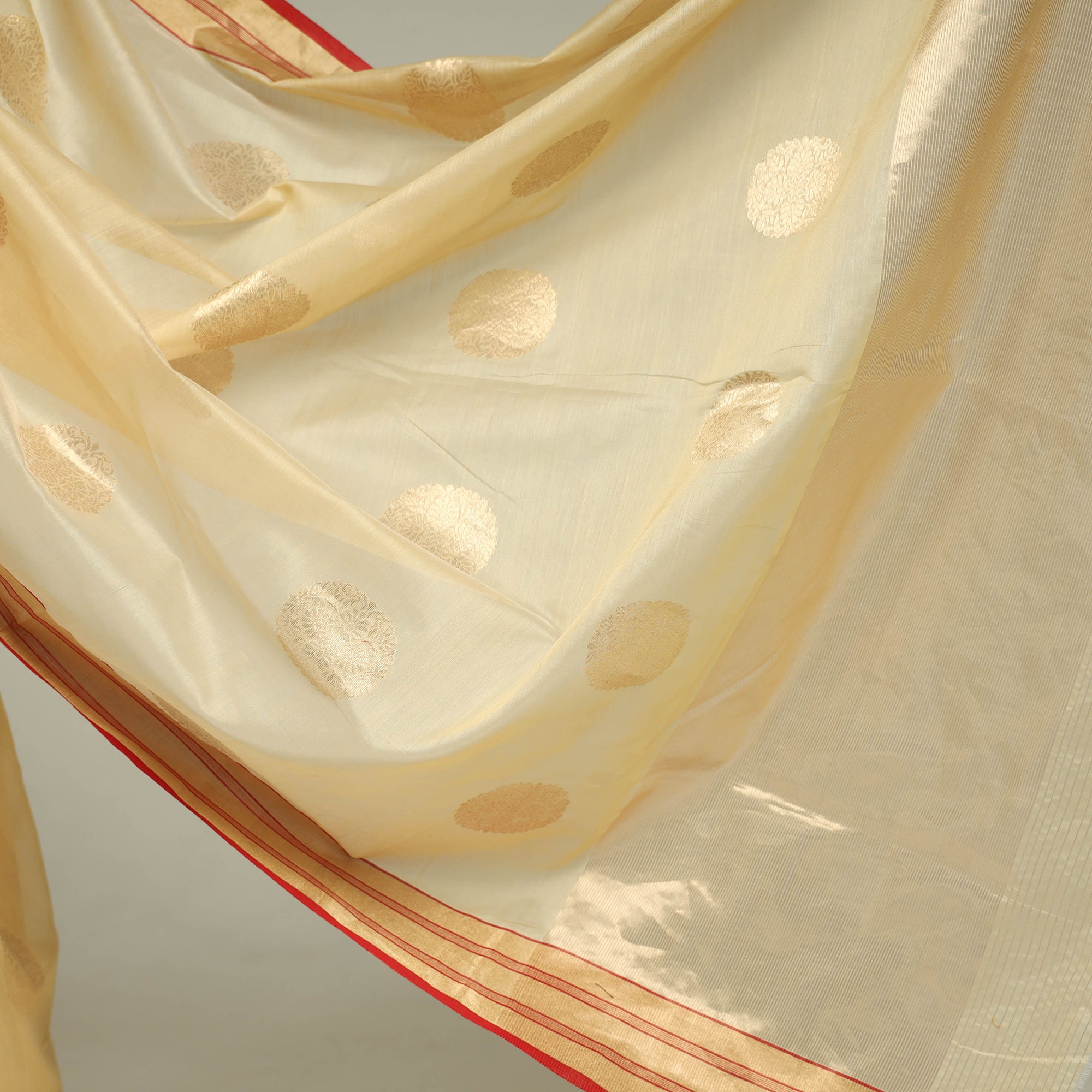 Fine quality handloom chanderi silk-cotton saree with intricate zari weaving by master artisan Rauph Khan. Chanderi silks are known for its gossamer looks and amazing feel. Chanderi weaving is practiced in the historic town of Chanderi in Madhya Pradesh. The buttis or motifs on chanderi blend are primarily hand woven on handloom, with the use of needles. Separate needles are used to create different motifs.