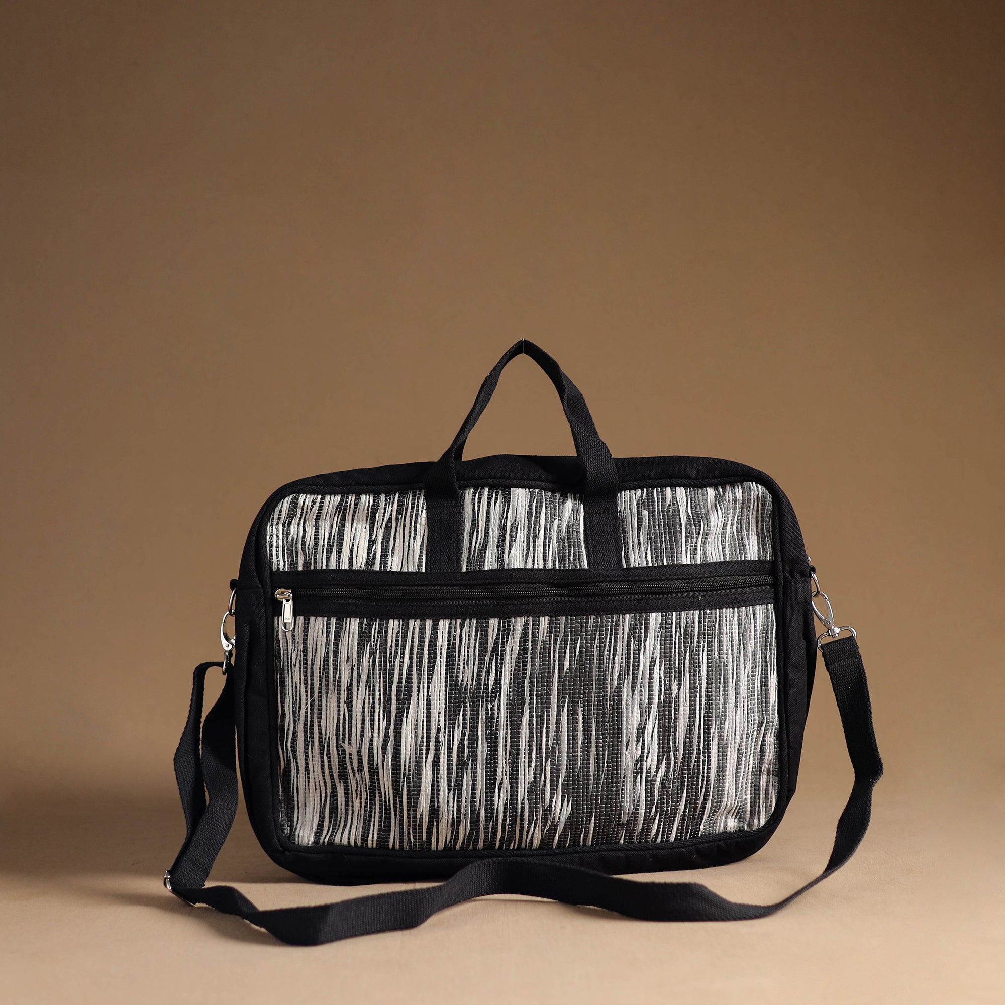 Upcycled plastic black handmade laptop bag with detachable sling by Ecokaari. It has one laptop compartment with one zipper pocket inside & two zipper pockets outside. You can easily carry 16" or less sized laptop in this bag. Keep your laptop safe in this stylish, durable bag with an adjustable shoulder strap. With its slim style and functionality, this bag is perfect for students and professionals who are always on the move. Keep your everyday essentials with plenty of room left for more. Our unique process of Upcycling uses a traditional Charkha & Handloom to weave a fabric from all the waste plastic that we've gathered. At first we collect waste plastic bags sanitize & sundried them. Then master artisans of Ecokaari manually cut plastic bags into strips. Then rolled on a traditional Charkha and woven into a fabric on a handloom. After woven into fabric it stitched in required designs to make products.
