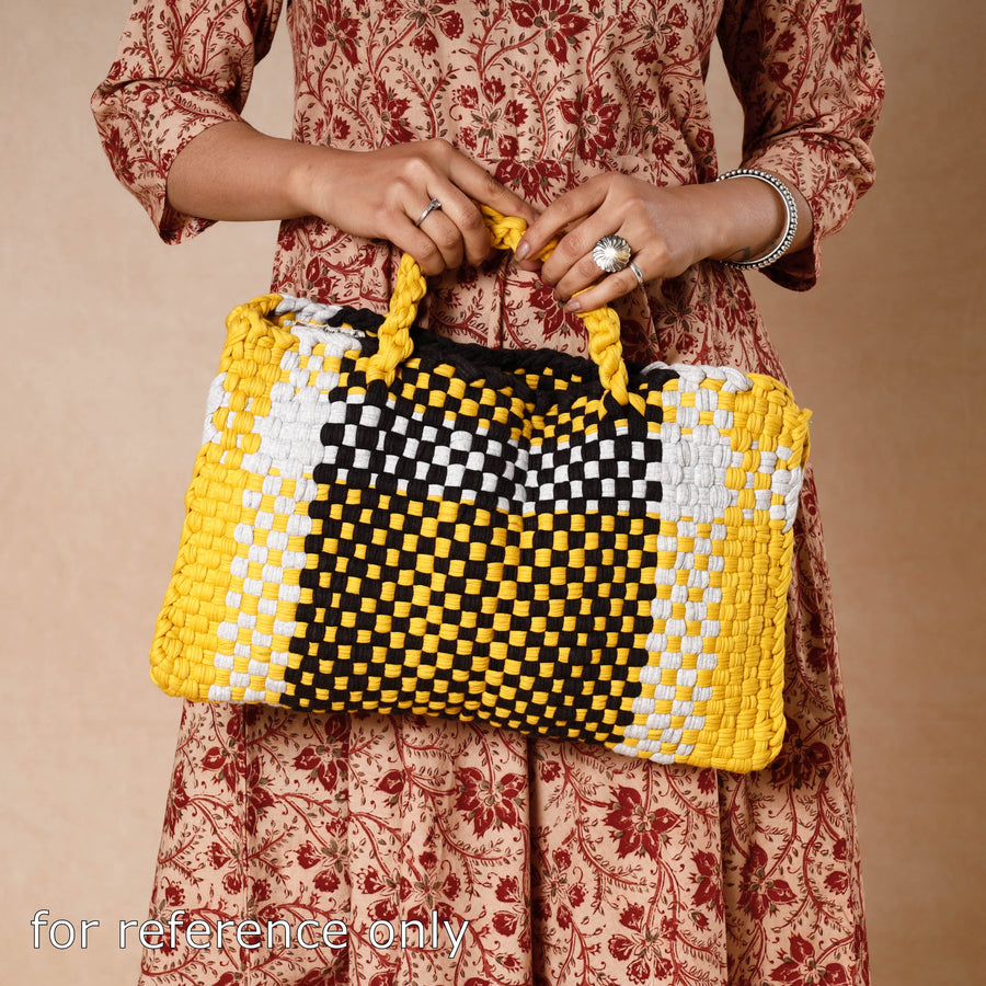 Fine quality handwoven upcycled cotton hand/laptop bag. Multi purpose Totes that can be used for storing laptops or any daily essentials. It perfectly fits 11 in to 16 in laptop. A perfect sized bag, good to carry around without being bulky & heavy. A true Trend Setter making a smart fashion statement. Perfect covering for storing laptops.Handwoven on wooden frames using upcycled 100% cotton hosiery yarn inline with environment protection policy.