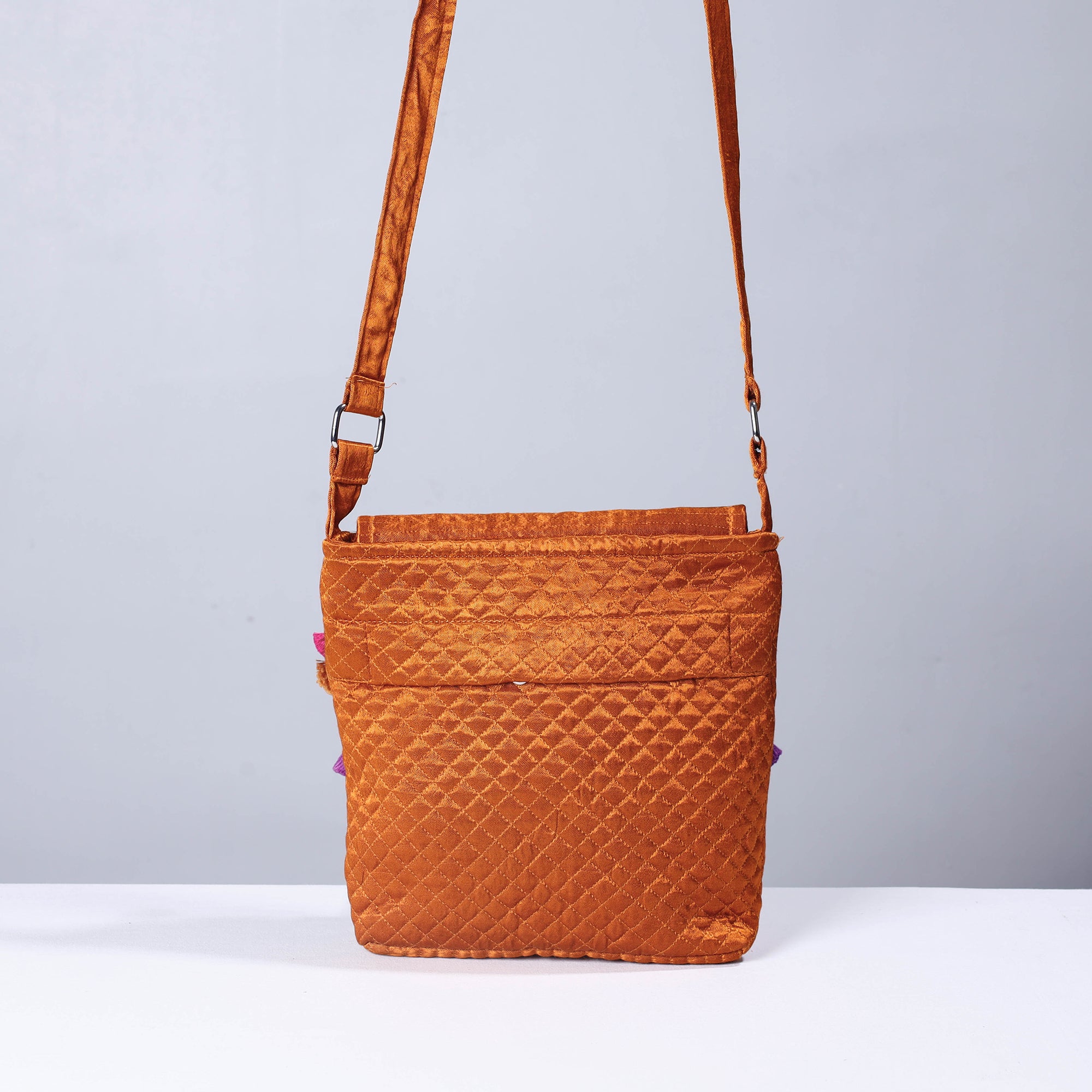 | Material | Fine quality orange soof stitch embroidery pure handloom mashru silk sling flap bag. It has one zipper pocket inside & one zipper pocket on backside. Ample space to keep most of your essentials.