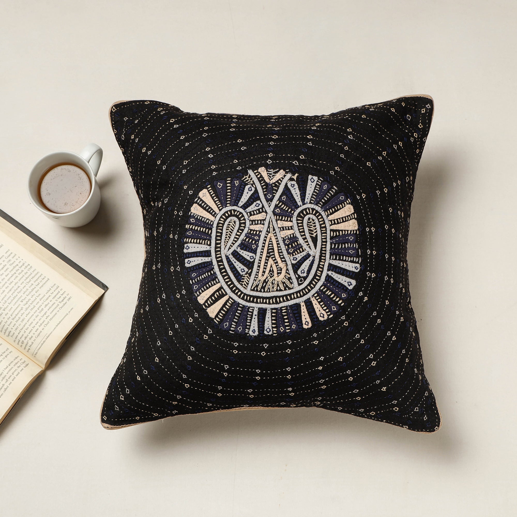 Applique dhebariya embroidery done on this beautiful cushion cover. Made of cotton fabric with hand embroidered mirror work done by craftswoman in Kutch region of Gujarat. Artisanal Community : Dhebariya Rabari. Dhebariya Rabari are one of the sub-sects of the Rabari community, and are traditionally shepherds. Since sewing embroidery for dowry was creating pressure on women, this traditional and ancient craft has been banned within the community for personal use over the past 20 years. They are known for their exquisite applique, katab (cut-work) and embroidery. Their embroidery includes birds, floral patterns, animals and mirrors of different shapes and sizes. Currently, most Rabari women who do embroidery are of the older generation and Qasab engages with the community for revival of this distinct artwork.