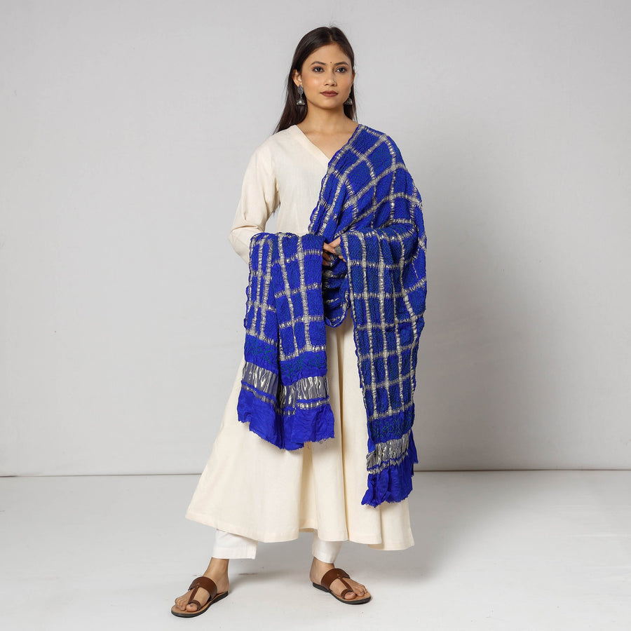 Fine quality kutch bandhani tie-dye modal silk zari checks dupatta featuring majestic bandhani pattern, tie-dyed using the traditional technique practised by the artisans of Kutch. The art of bandhani (bandhej) is highly skilled process. The technique involves dyeing a fabric which is tied tightly with a thread at several points. Very silky and smooth feel. Modal silk is a soft, shiny and highly lustrous fabric, achieved through interlacing modal fibers and silk yarns. it has opulence of silk and the comfort of cotton modal is a fine and soft textured weave.