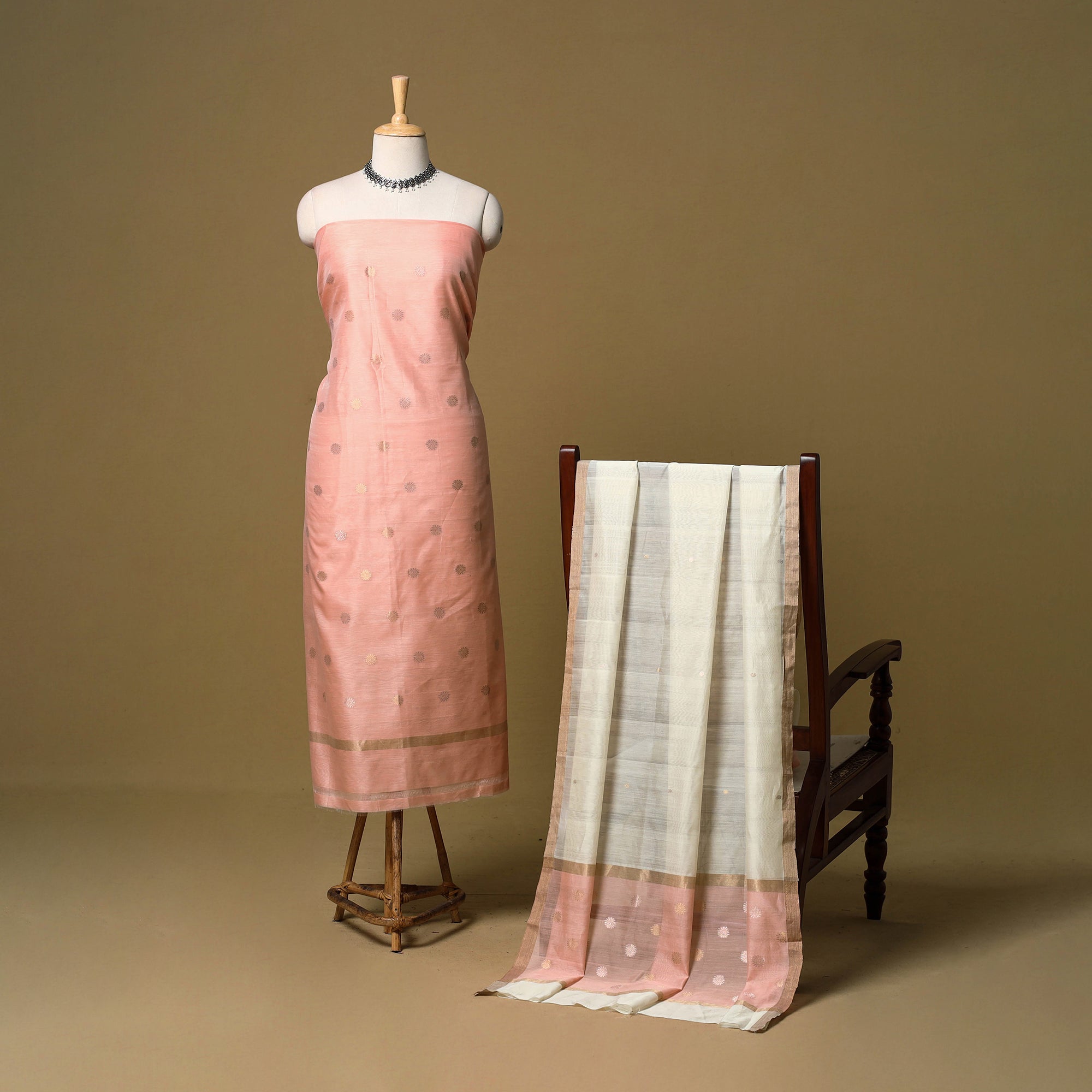 Fine quality peach chanderi silk-cotton handloom 2pc suit material set with intricate zari weaving by master artisan Rauph Khan. Chanderi weaving is practiced in the historic town of Chanderi in Madhya Pradesh. The buttis or motifs on chanderi blend are primarily hand woven on handloom, with the use of needles. Separate needles are used to create different motifs.