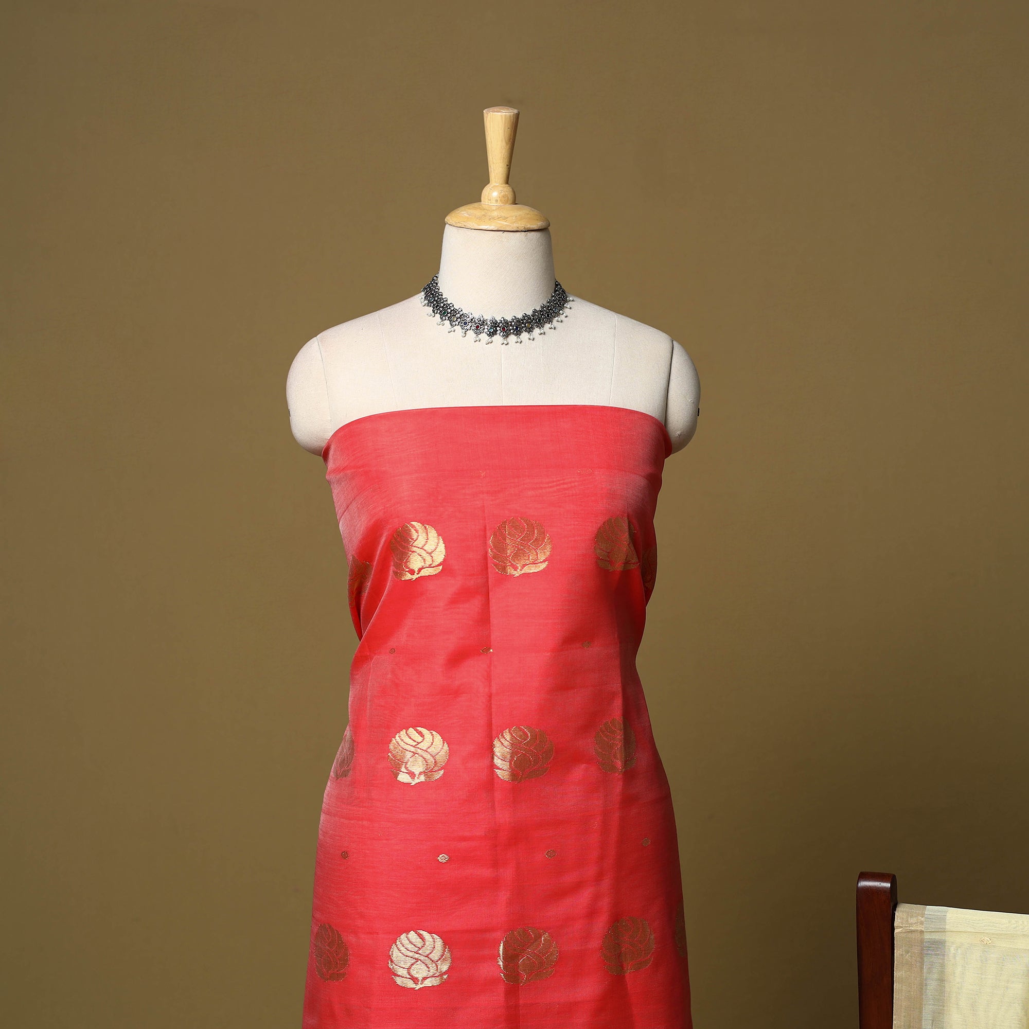Fine quality red chanderi silk-cotton handloom 2pc suit material set with intricate zari weaving by master artisan Rauph Khan. Chanderi weaving is practiced in the historic town of Chanderi in Madhya Pradesh. The buttis or motifs on chanderi blend are primarily hand woven on handloom, with the use of needles. Separate needles are used to create different motifs.