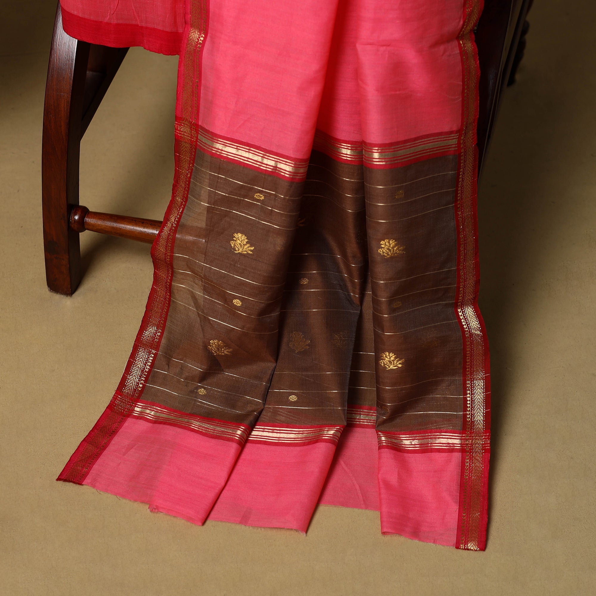 Fine quality brown handloom chanderi silk-cotton 3pc suit material set with intricate zari weaving by master artisan Rauph Khan. Chanderi weaving is practiced in the historic town of Chanderi in Madhya Pradesh. The buttis or motifs on chanderi blend are primarily hand woven on handloom, with the use of needles. Separate needles are used to create different motifs.