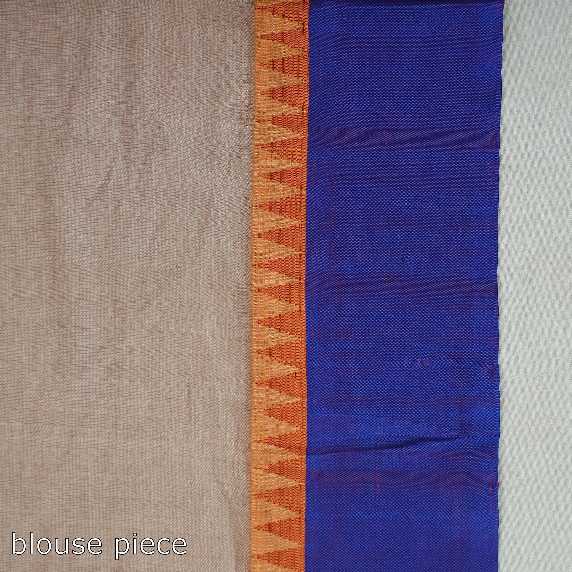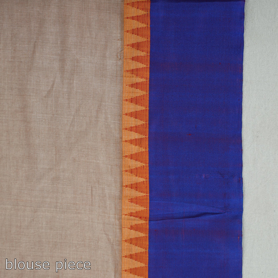 Fine quality traditional Kanchipuram handloom pure mercerised cotton saree with silk temple border from Kanchipuram, the temple city of Tamil Nadu. Characterized by expansive borders and quirky motifs, these cotton sarees from Kanchi are a spin on the Konrad temple sarees of Tamil Nadu that were used as a drape for deities. The Kanchipuram cotton saree undergoes a long, meticulous weaving process wherein the signature temple border, the wide pallav, and the main body that these Kanchi cotton sarees are really known for are woven individually, which are then delicately woven into one single piece.