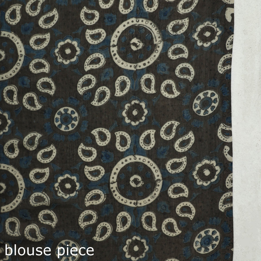 Fine quality grey hand block printed mul cotton ajrakh saree with tassels, made using natural dyes through traditional ajrakh technique of hand block printing practised by the artisans in Kutch region of Gujarat. Ajrakh is a traditional vegetable dyeing and resist block-printing technique on cloth. It is estimated to be around 4,500 years old. The Ajrakh artisans in India are originally from Sindh and they migrated to Kutch in Gujarat and Barmer in Rajasthan. Ajrakh is the traditional attire of the Maldhari pastoral community of Bhuj. The process of 'Ajrakh' is a long drawn process with many stages and each layer of colour is printed after a gap of time so the cloth has to stay for the day. |
