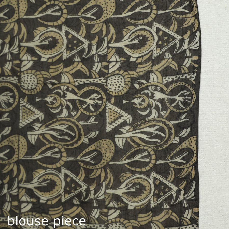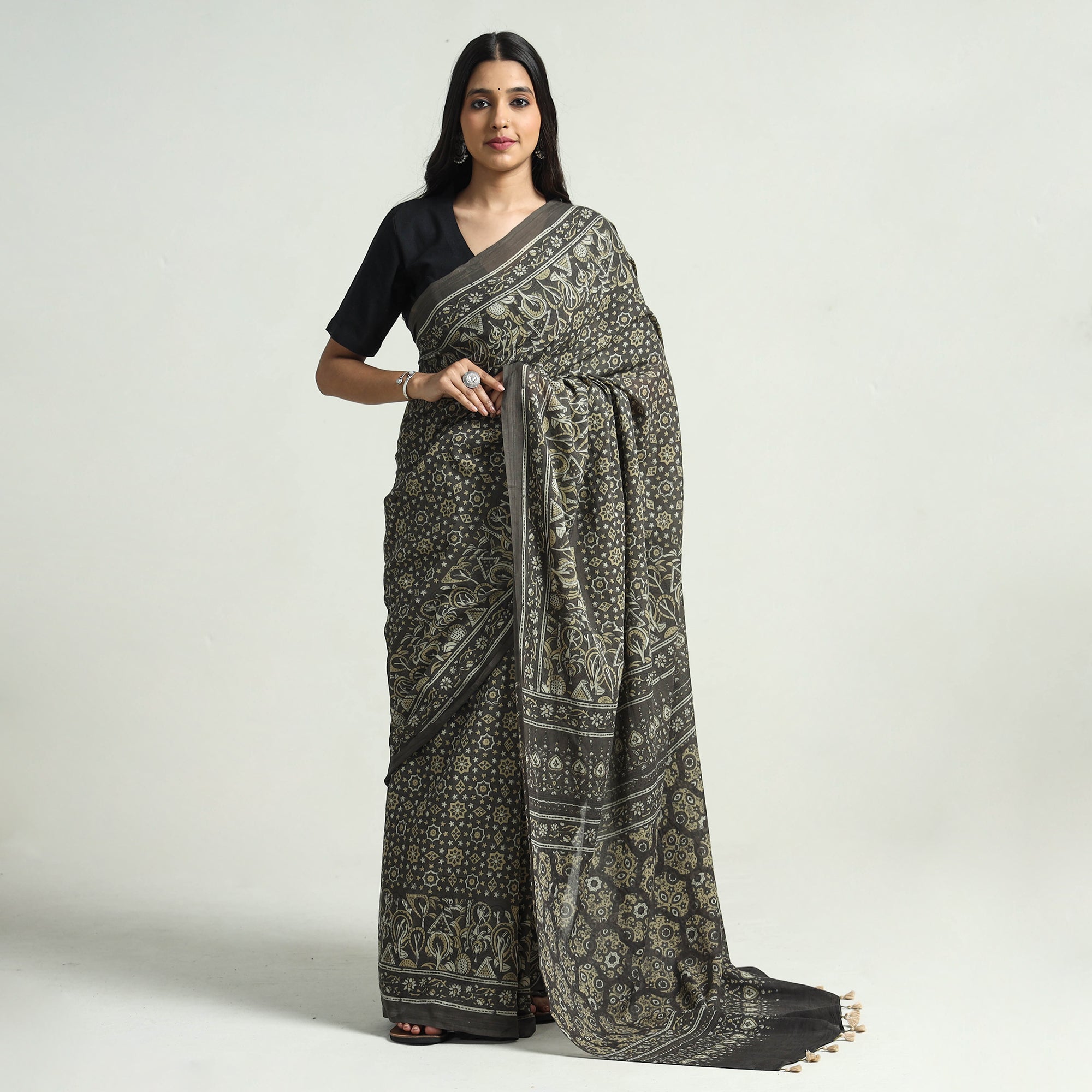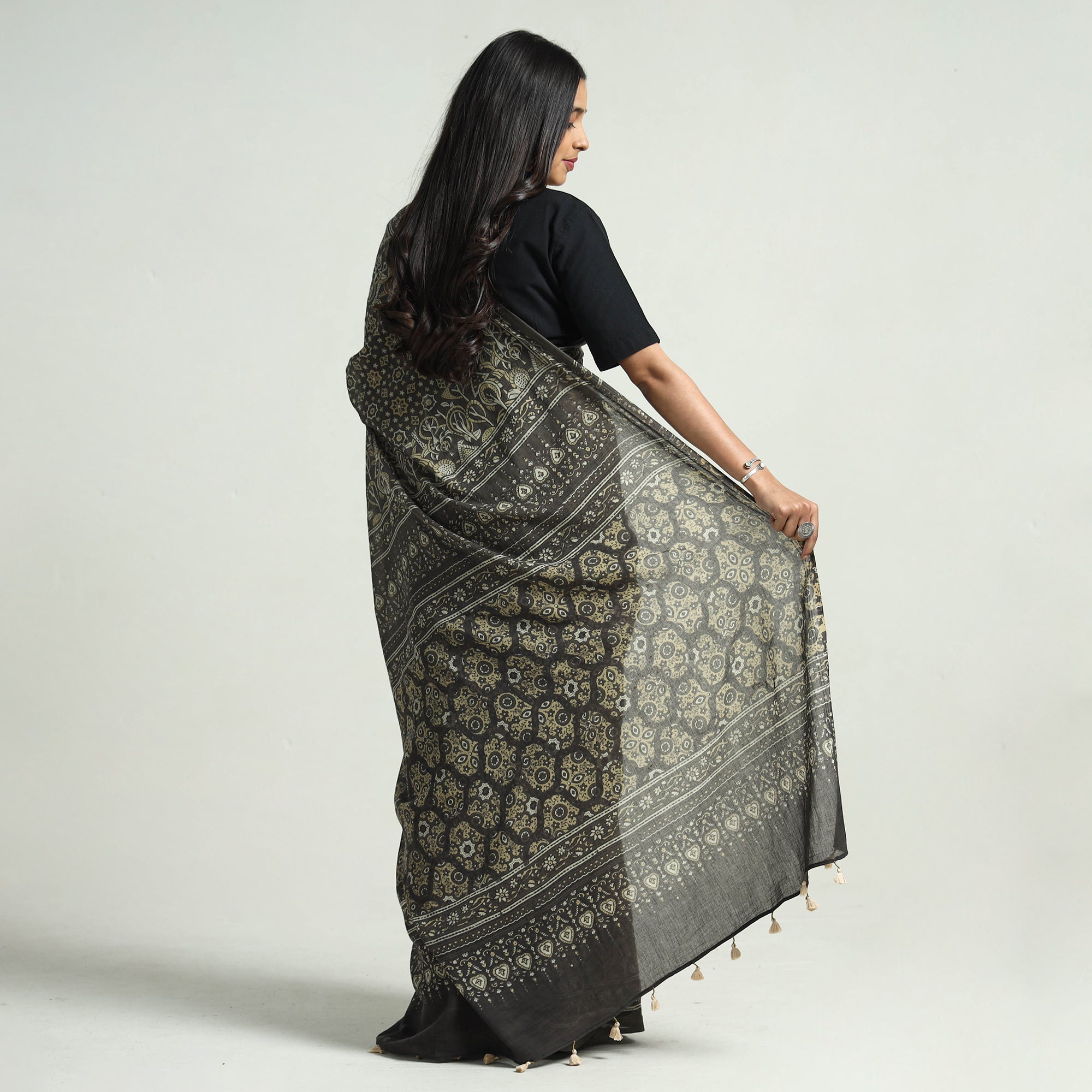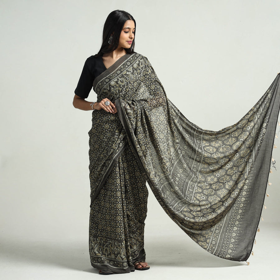 Fine quality grey hand block printed mul cotton ajrakh saree with tassels, made using natural dyes through traditional ajrakh technique of hand block printing practised by the artisans in Kutch region of Gujarat. Ajrakh is a traditional vegetable dyeing and resist block-printing technique on cloth. It is estimated to be around 4,500 years old. The Ajrakh artisans in India are originally from Sindh and they migrated to Kutch in Gujarat and Barmer in Rajasthan. Ajrakh is the traditional attire of the Maldhari pastoral community of Bhuj. The process of 'Ajrakh' is a long drawn process with many stages and each layer of colour is printed after a gap of time so the cloth has to stay for the day. |
