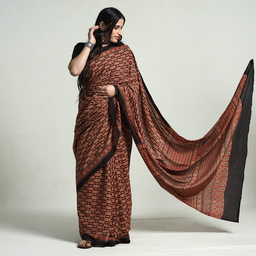 This brown natural dyed hand block print cotton ajrakh saree showcases the timeless craftsmanship of the Kutch artisans. Made with natural dyes using a 4,500-year-old resist-dyeing technique, each saree tells a story of heritage and skill. The Ajrakh process is intricate, involving multiple stages of printing and dyeing to create its iconic geometric motifs. Perfect for special occasions, this saree offers elegance with sustainability. Celebrate culture and artistry with every drape.