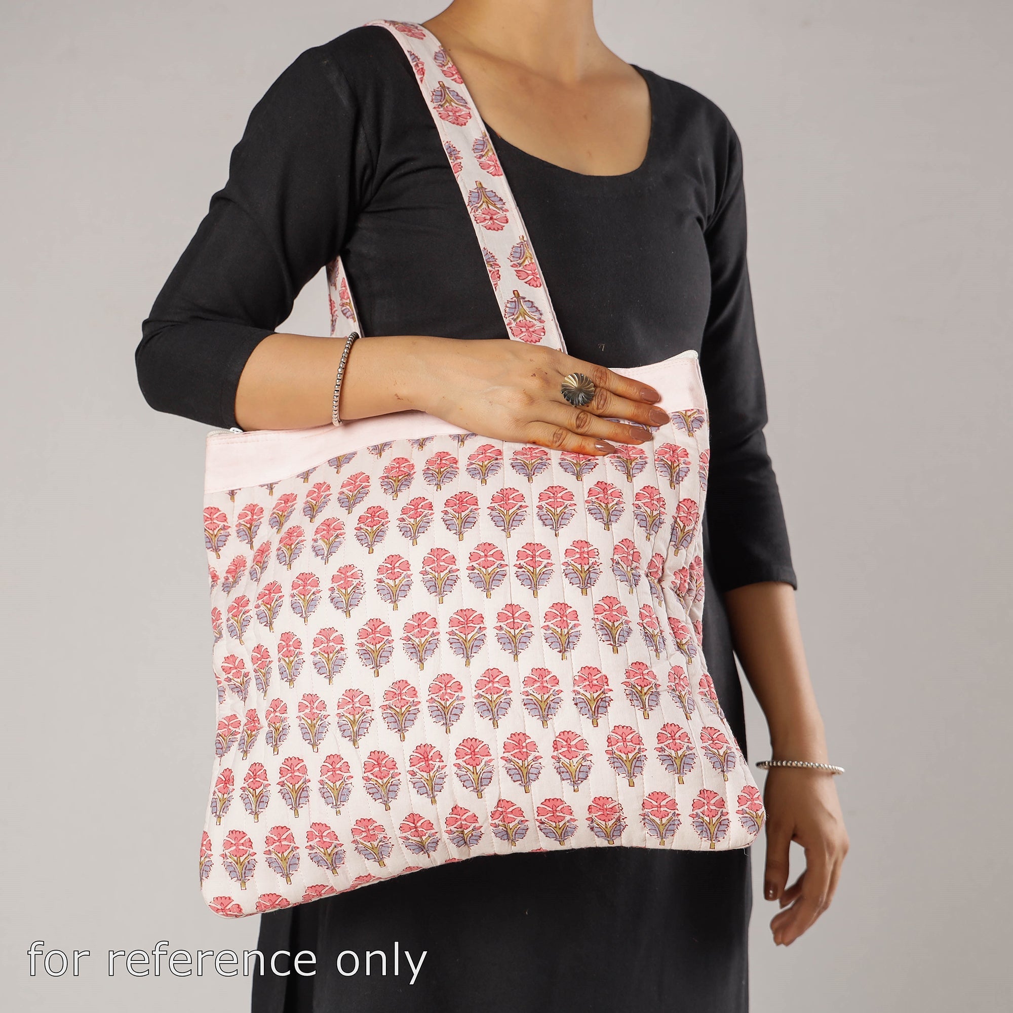 Fine quality blue quilted work shoulder bagmade from cotton fabrics with hand stitched contemporary patterns handmade by the women of Purkal Stree Shakti Samiti, Dehradun. It has one zipper pocket with cotton fabric lining inside.
