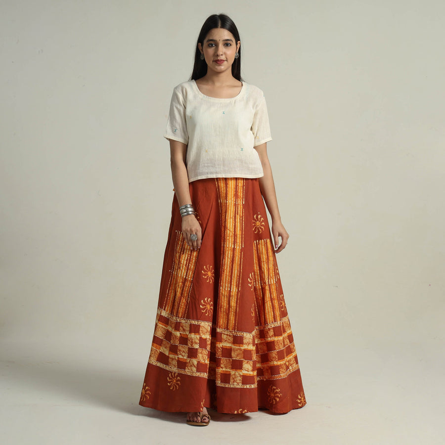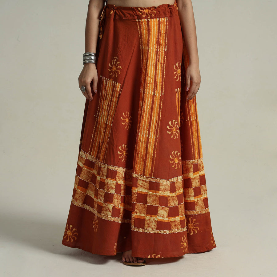 Fine quality brown hand batik printed cotton long skirt designed with contemporary running stitch patterns. Batik is a technique of wax-resist dyeing applied to whole cloth, or cloth made using this technique. The traditional designs and motifs in Indian batik are often passed down from one generation to another. Super light weight.