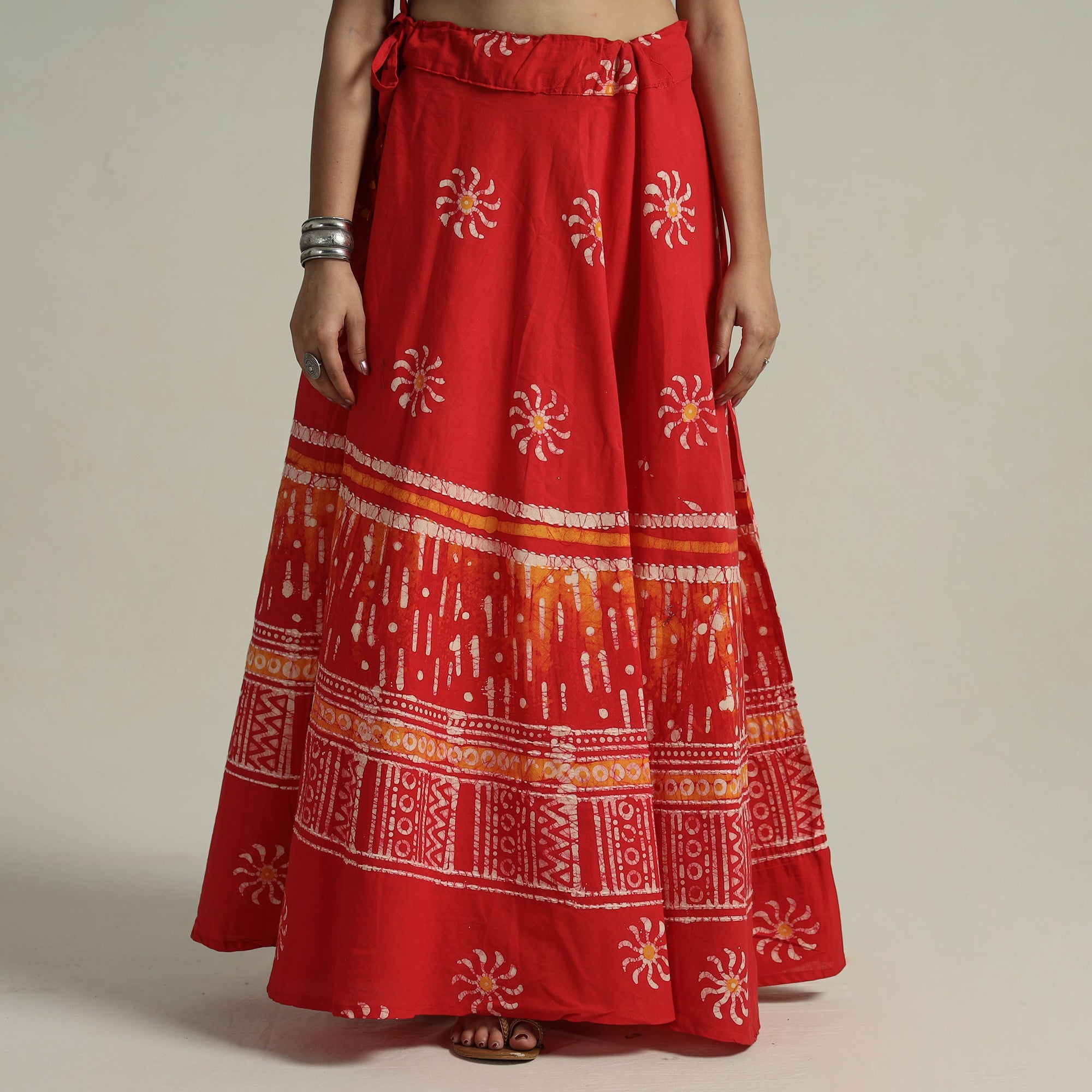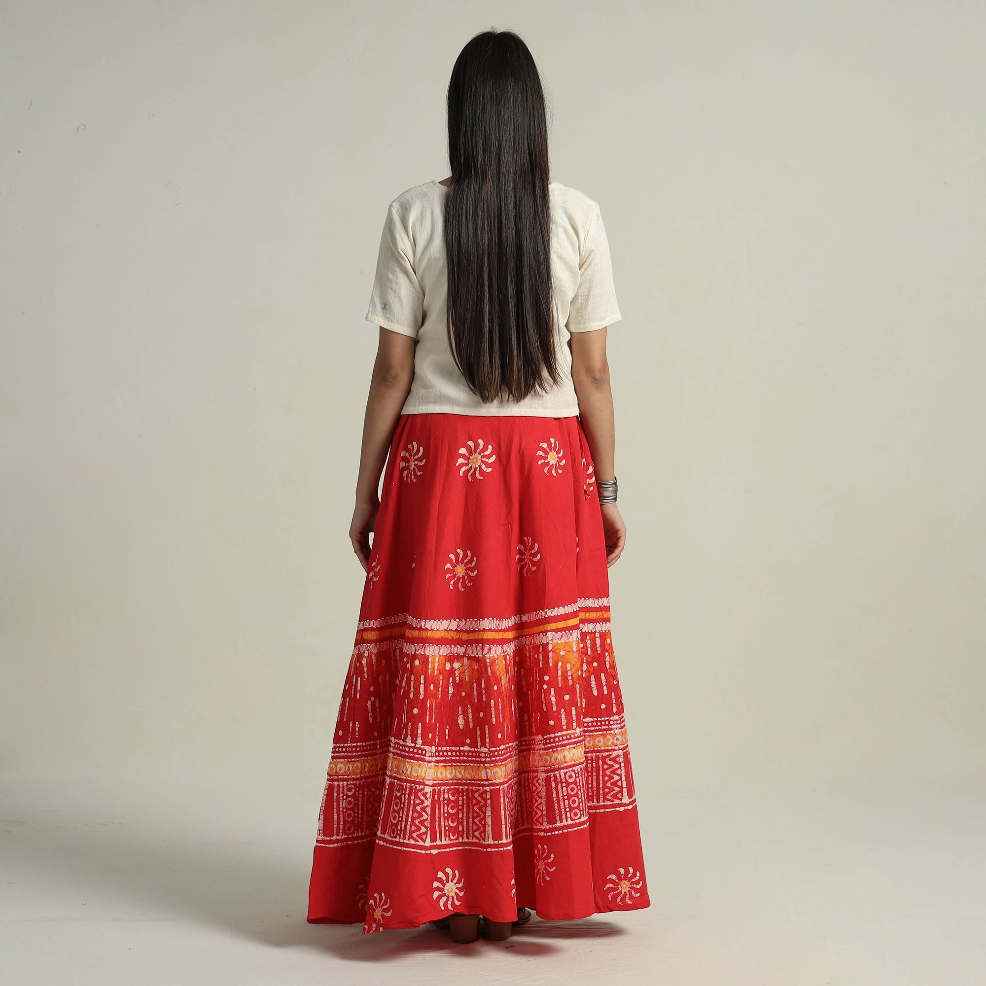 Fine quality red hand batik printed cotton long skirt designed with contemporary running stitch patterns. Batik is a technique of wax-resist dyeing applied to whole cloth, or cloth made using this technique. The traditional designs and motifs in Indian batik are often passed down from one generation to another. Super light weight.