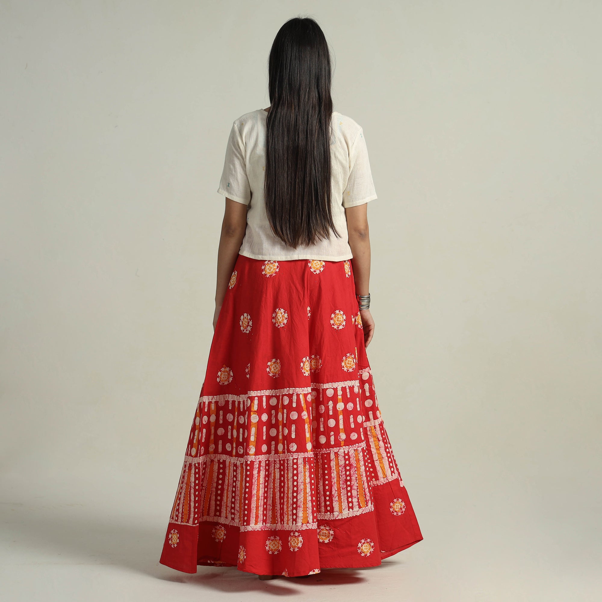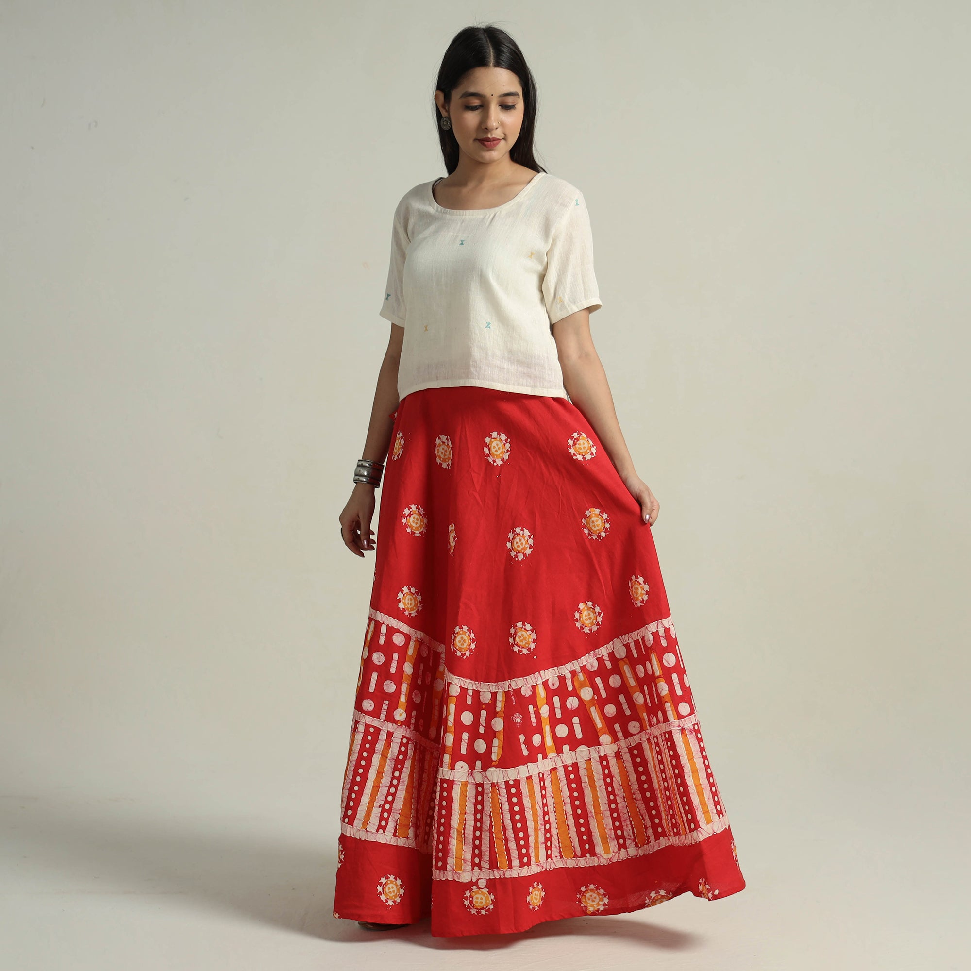 Fine quality red hand batik printed cotton long skirt designed with contemporary running stitch patterns. Batik is a technique of wax-resist dyeing applied to whole cloth, or cloth made using this technique. The traditional designs and motifs in Indian batik are often passed down from one generation to another. Super light weight.