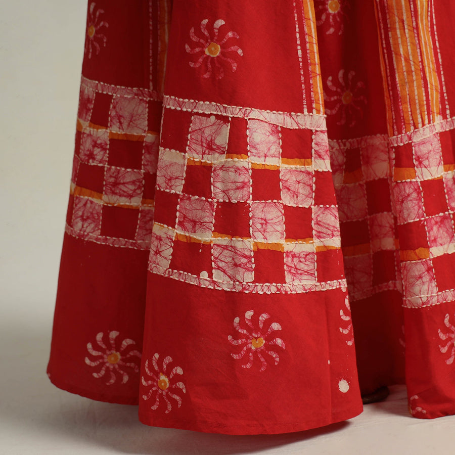 Fine quality red hand batik printed cotton long skirt designed with contemporary running stitch patterns. Batik is a technique of wax-resist dyeing applied to whole cloth, or cloth made using this technique. The traditional designs and motifs in Indian batik are often passed down from one generation to another. Super light weight.