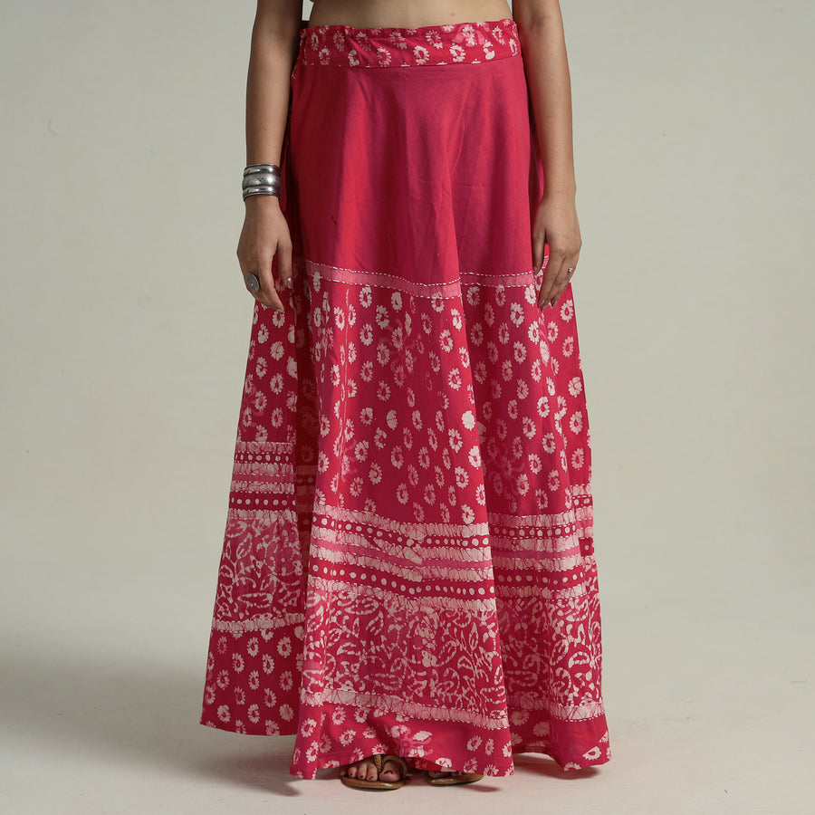 Fine quality pink hand batik Printed cotton long skirt designed with contemporary running stitch patterns. Batik is a technique of wax-resist dyeing applied to whole cloth, or cloth made using this technique. The traditional designs and motifs in Indian batik are often passed down from one generation to another. Super light weight.