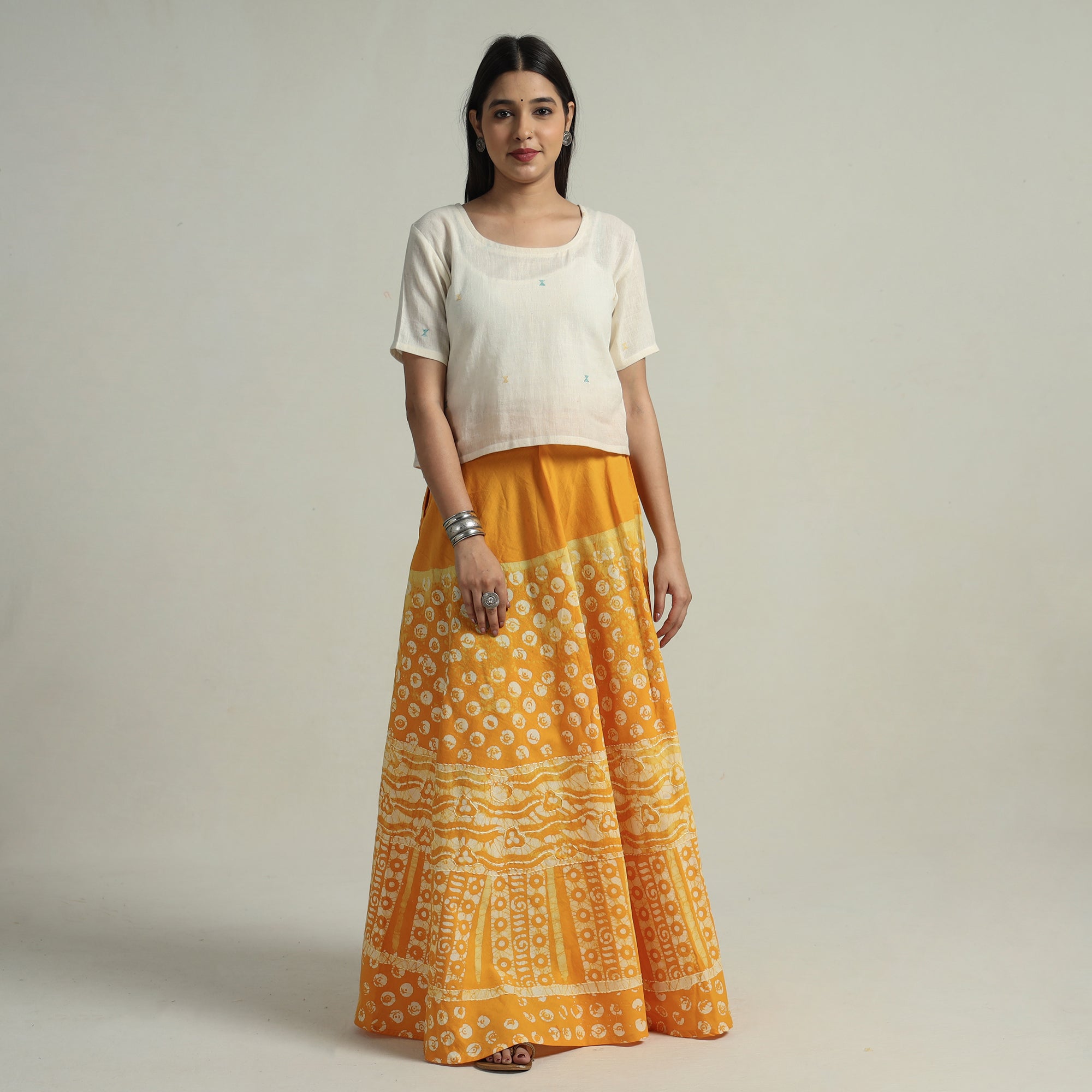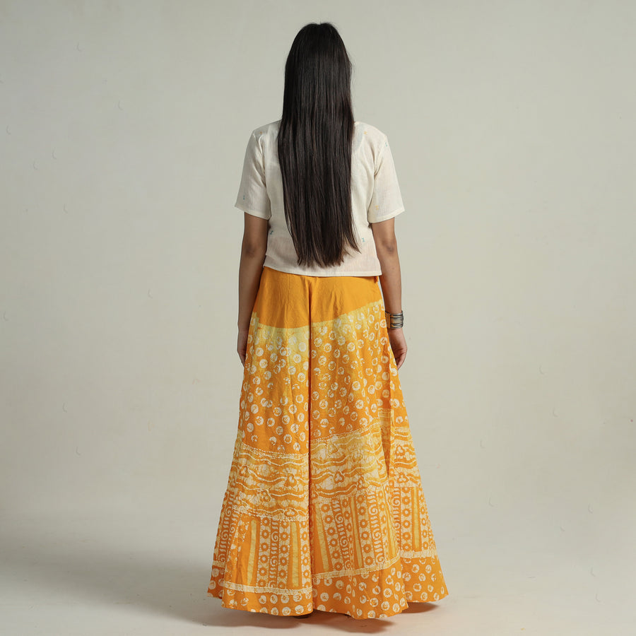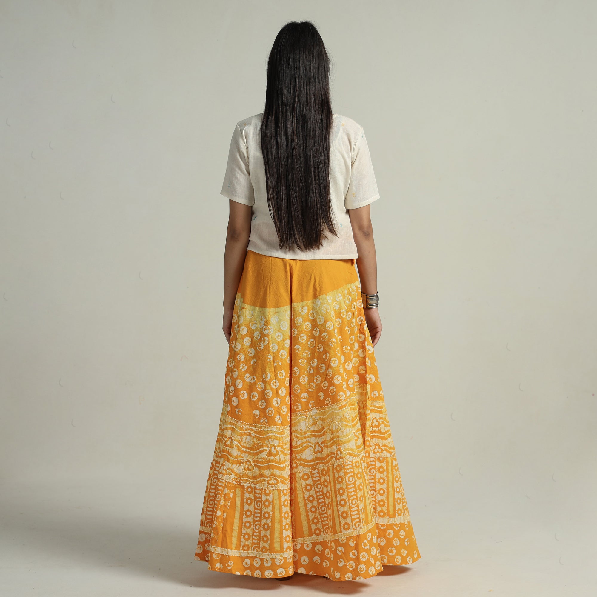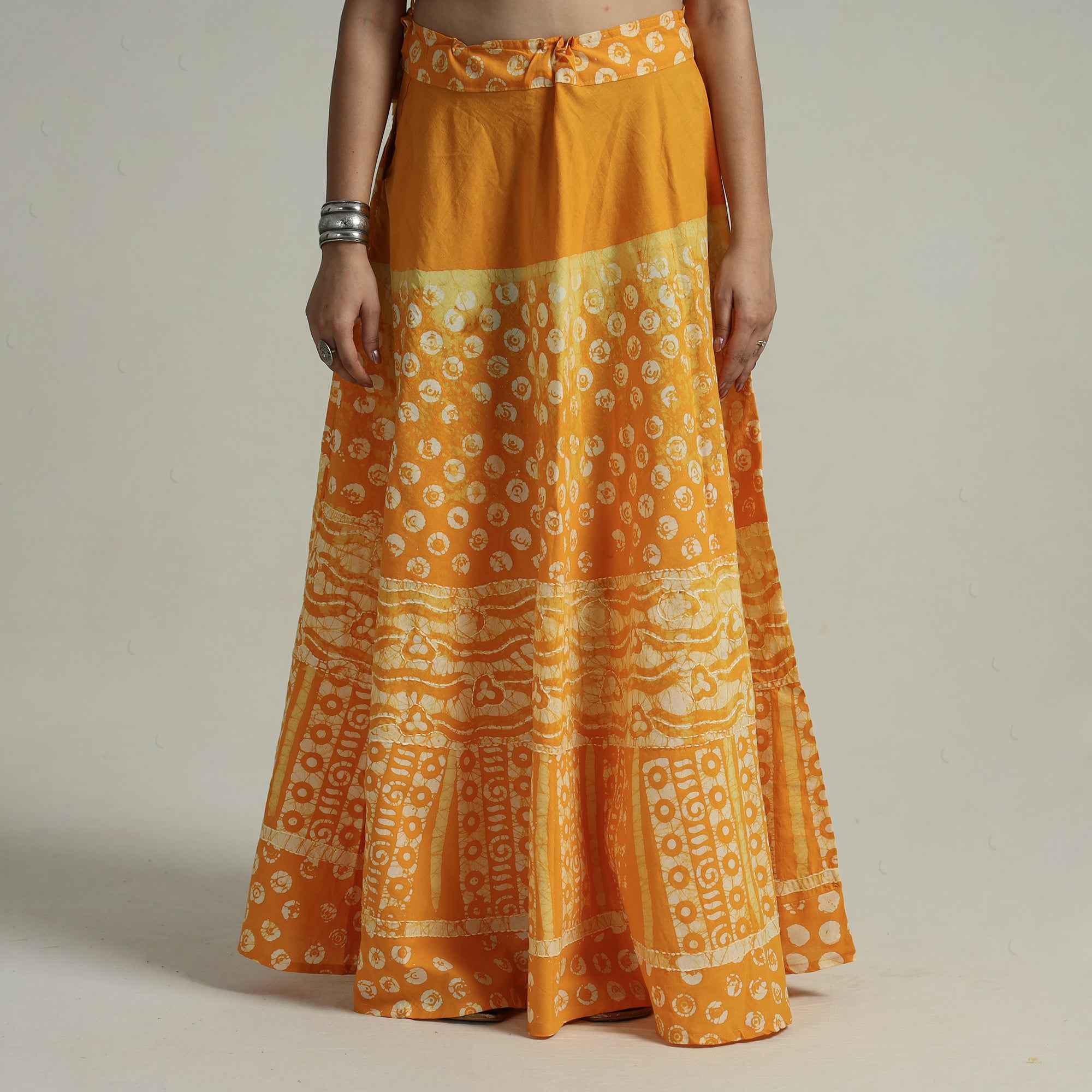 Fine quality yellow hand batik printed cotton long skirt designed with contemporary running stitch patterns. Batik is a technique of wax-resist dyeing applied to whole cloth, or cloth made using this technique. The traditional designs and motifs in Indian batik are often passed down from one generation to another. Super light weight.