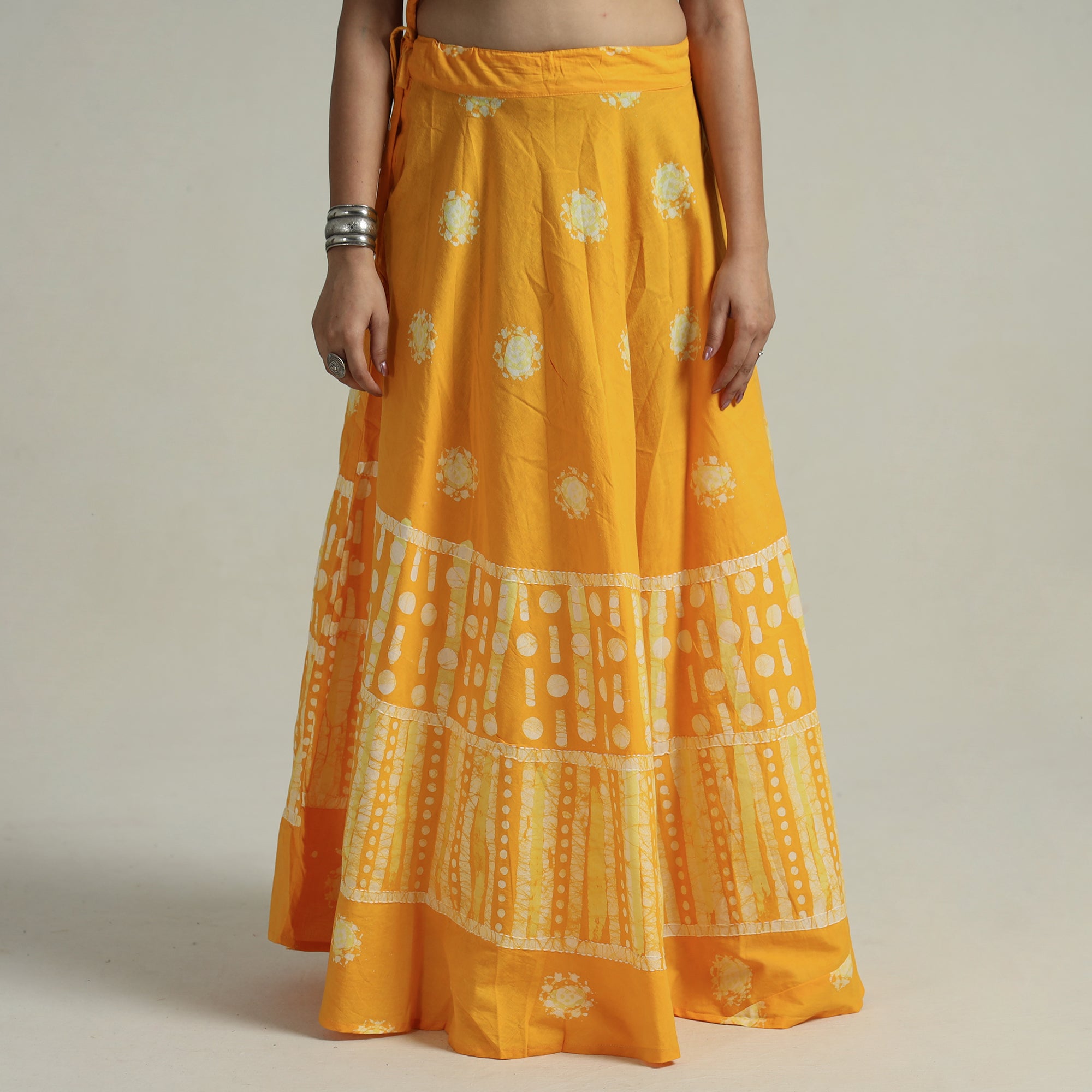 Fine quality yellow hand batik printed cotton long skirt designed with contemporary running stitch patterns. Batik is a technique of wax-resist dyeing applied to whole cloth, or cloth made using this technique. The traditional designs and motifs in Indian batik are often passed down from one generation to another. Super light weight.