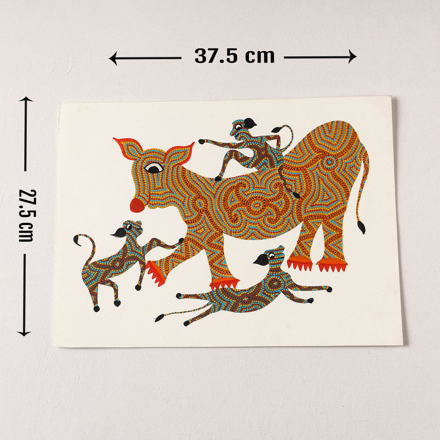 Traditional Bhil Pithora folk artwork on thick art paper with permanent ink and acrylic colours. This exquisite Bhil art comes from the family of Geeta Bariya. Geeta is the daughter-in-law of Bhuribai, a famous Bhil artist. She learnt painting after she got married. She has participated in various workshops. The Bhils are the second largest tribe in India and reside in western and central India, in the states of Madhya Pradesh, Gujarat, Rajasthan, and Maharashtra. The history of Bhil art is as old as the Bhils themselves. The art is simple images of everyday life for this tribe, the Bhils live close to nature and lead a largely agricultural life. Their paintings reflect the changing seasons, the natural phenomena that guide their harvest, and the gods that protect them. Their houses have beautiful frescos of images from myth and folklore on the walls and ceilings. Dots are the signature of Bhil art paintings. Dots of different colours on plain backgrounds are used to depict stories, memories, and prayers.
