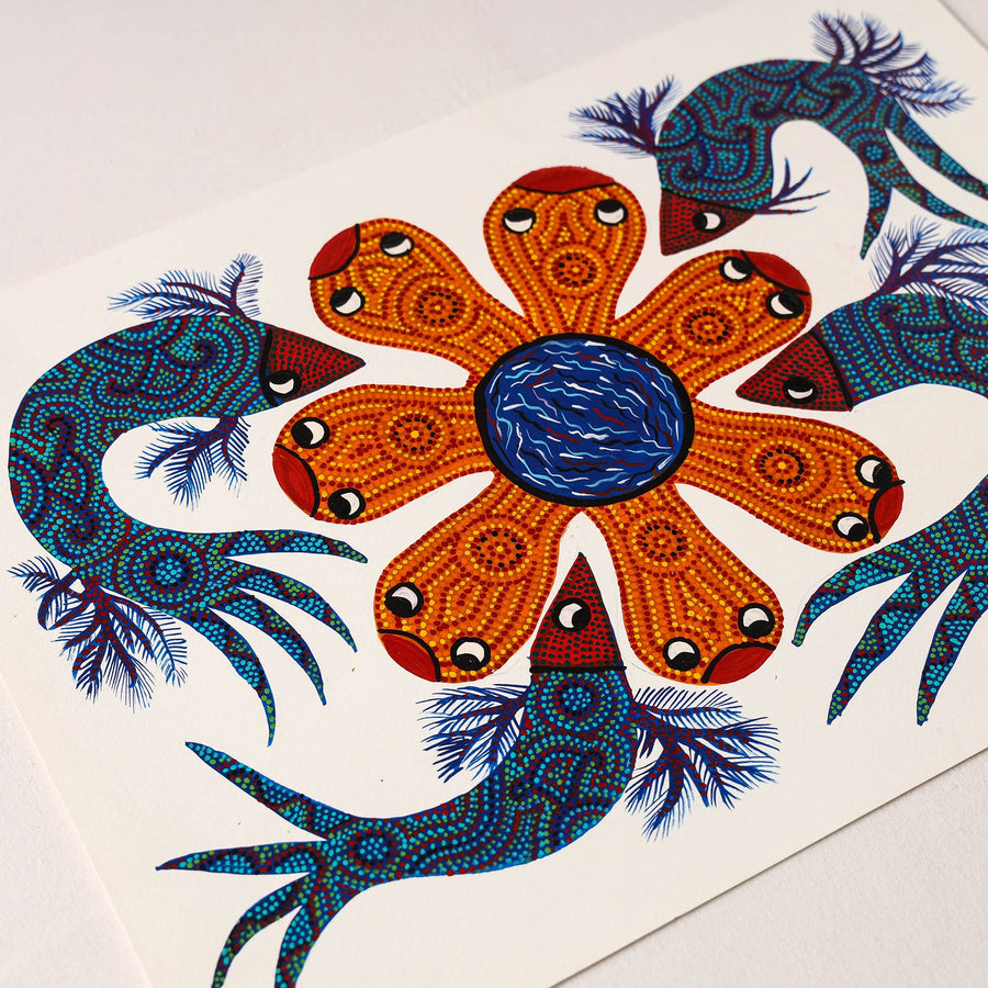 Traditional Bhil Pithora folk artwork on thick art paper with permanent ink and acrylic colours. This exquisite Bhil art comes from the family of Geeta Bariya. Geeta is the daughter-in-law of Bhuribai, a famous Bhil artist. She learnt painting after she got married. She has participated in various workshops. The Bhils are the second largest tribe in India and reside in western and central India, in the states of Madhya Pradesh, Gujarat, Rajasthan, and Maharashtra. The history of Bhil art is as old as the Bhils themselves. The art is simple images of everyday life for this tribe, the Bhils live close to nature and lead a largely agricultural life. Their paintings reflect the changing seasons, the natural phenomena that guide their harvest, and the gods that protect them. Their houses have beautiful frescos of images from myth and folklore on the walls and ceilings. Dots are the signature of Bhil art paintings. Dots of different colours on plain backgrounds are used to depict stories, memories, and prayers.