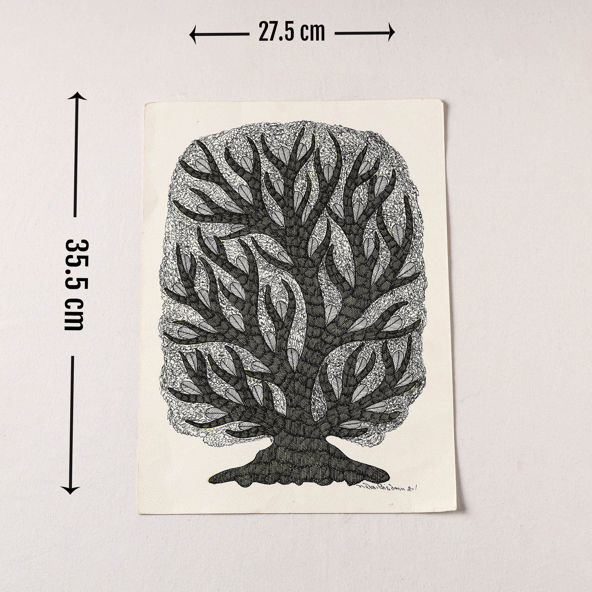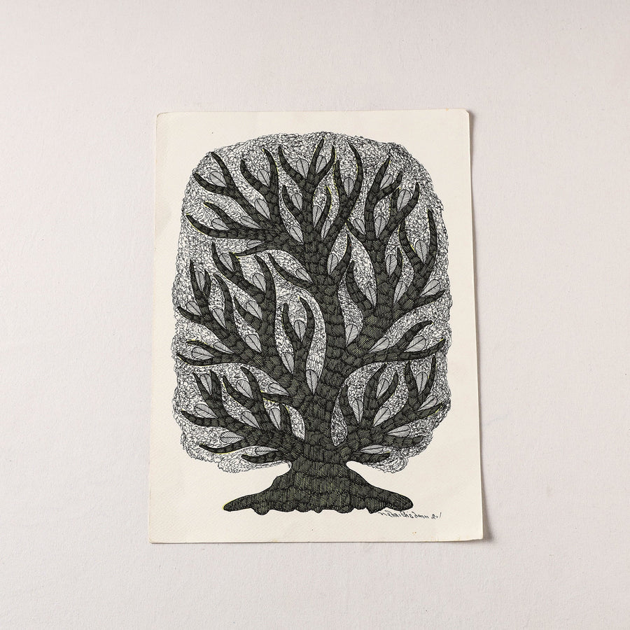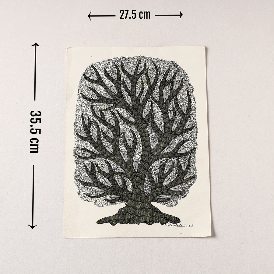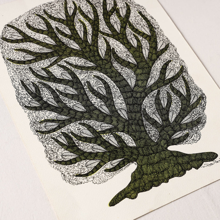 This original work of gond art is done on art paper base made using tanon ink. This Indian tribal art comes from Bhopal from the family of Gariba Singh Tekam. A wonderful painting for the discerning decor aficionado or a gift for an art lover. These are priceless collectibles.